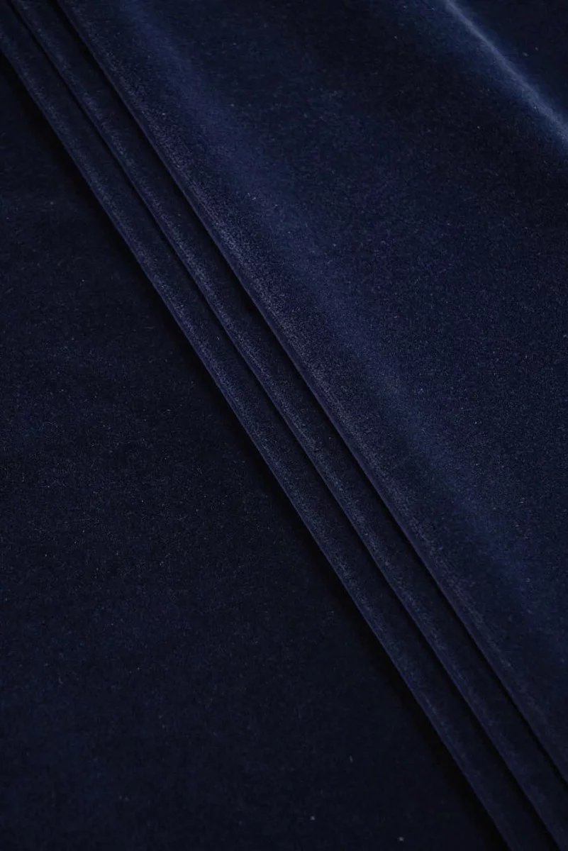 Itališkas aksomas gražios tamsiai mėlynos spalvos. Audinys, austas iš medvilninių siūlų, elastingas, mėsingas, šiek tiek standus. Puikiai tinka sijono, švarko, plono palto siuvimui.
