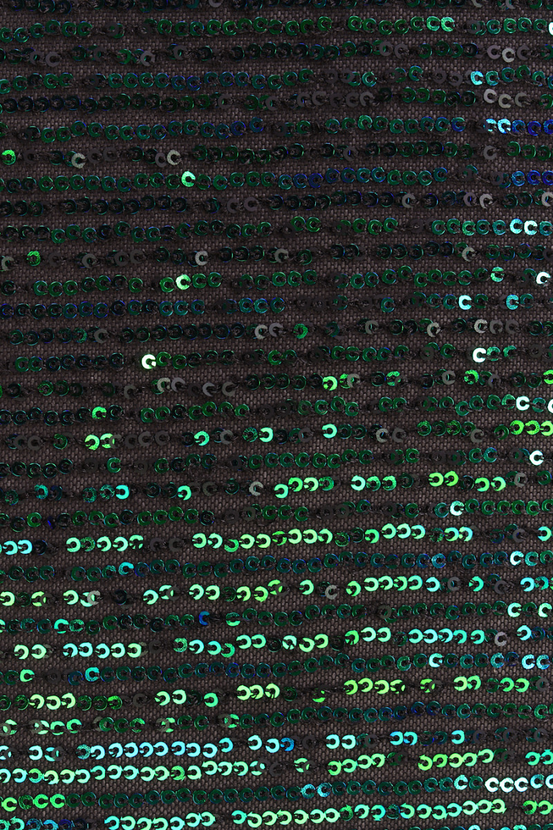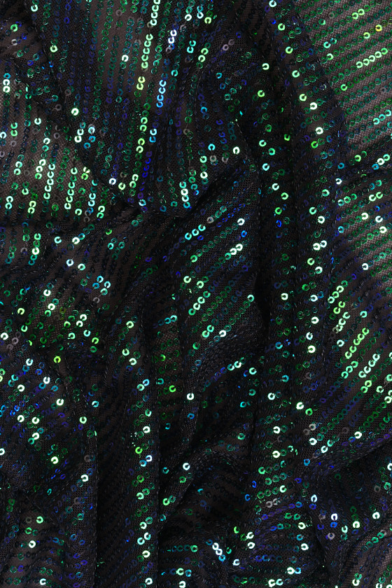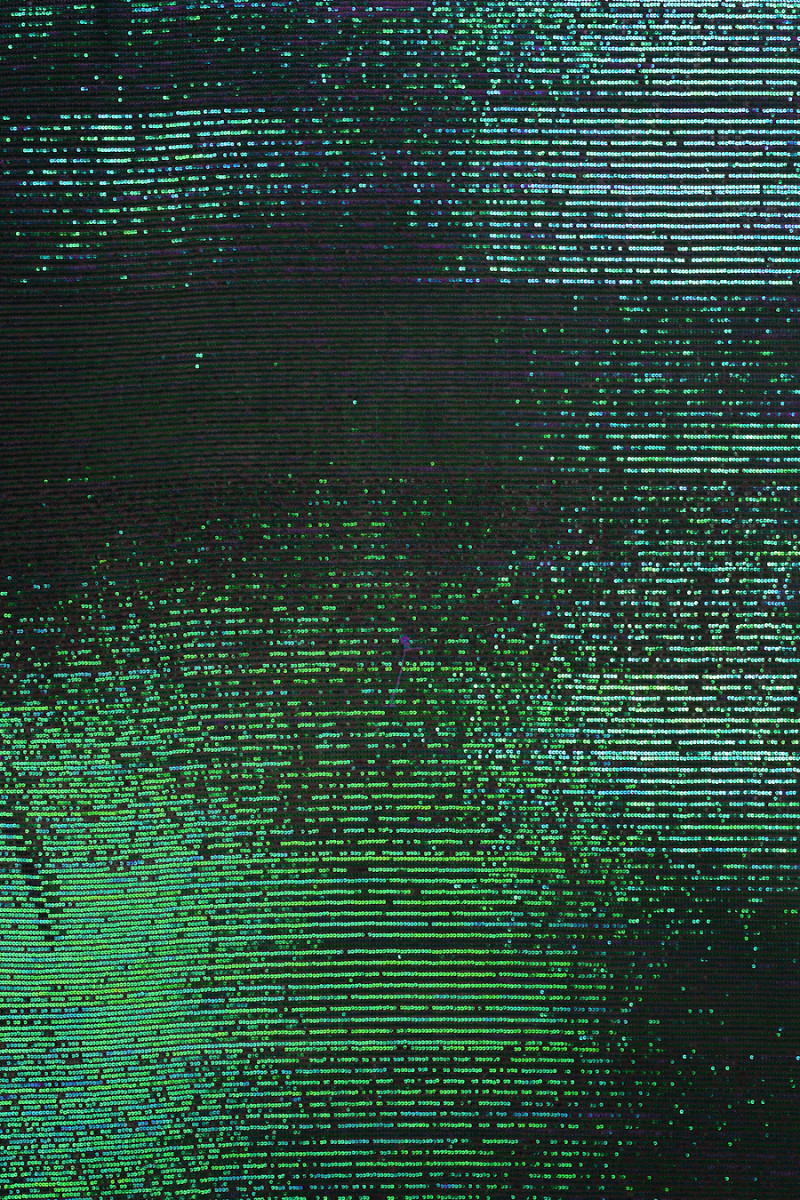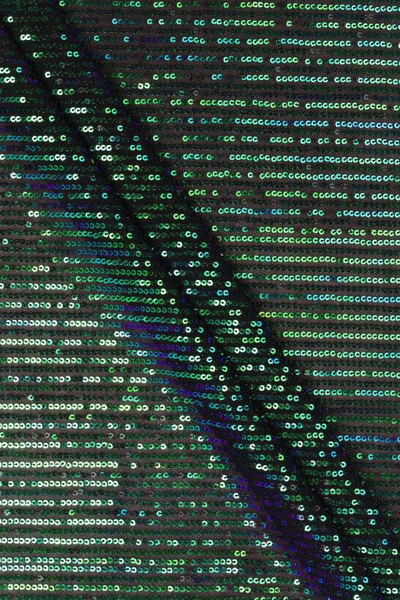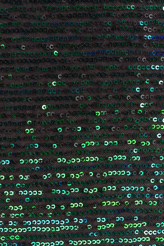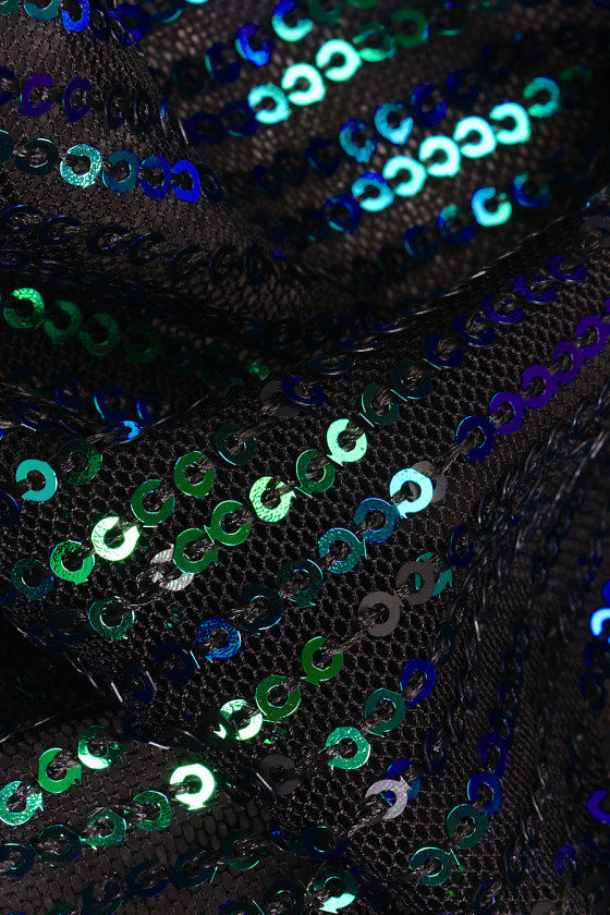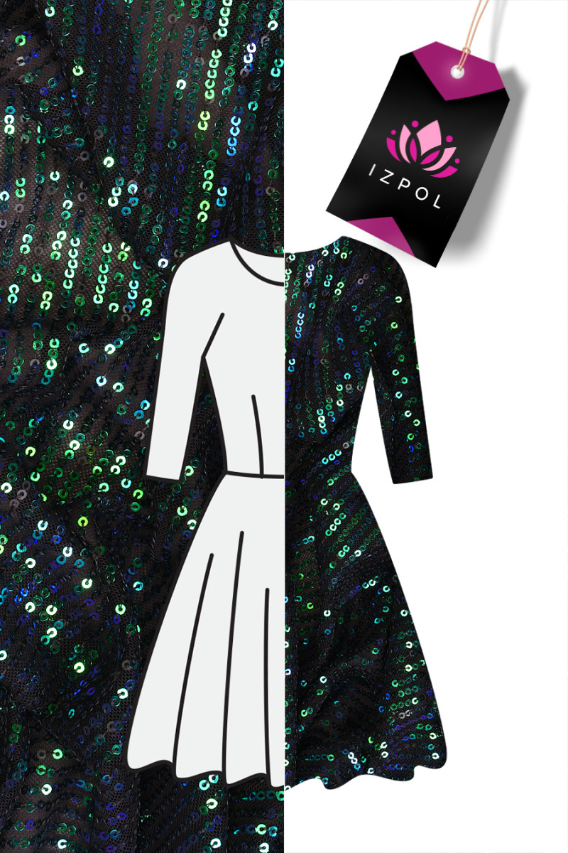 Itališkas vakarinis audinys - originalūs žalios ir violetinės spalvos blizgučiai - spindi priklausomai nuo šviesos kampo. Gražūs, maži blizgučiai, siuvami ant elastingo tinklelio. Audinys yra sunkus, gražiai blizgus, elastingas. Gražus pasiūlymas žmonėms, kurie šį sezoną mėgsta originalius madingiausių spalvų motyvus.