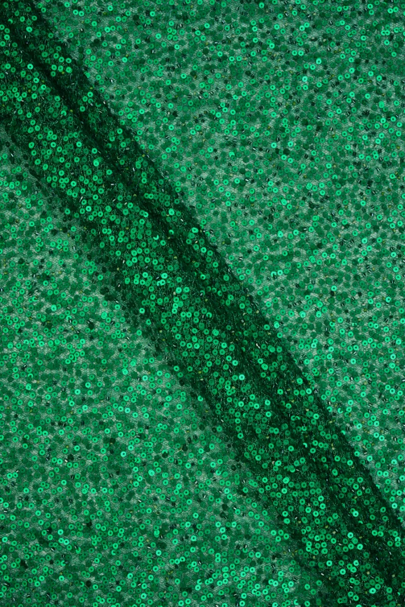 Itališkas vakarinis audinys tinklo pavidalu su netaisyklingomis žaliomis kilpomis. Jis gausiai dekoruotas sultingais žaliais blizgučiais ir žaliais karoliukais, todėl jis yra labai efektyvus. Tankios dekoracijos gražiai šviečia šviesoje ir suteikia audiniui elegancijos. Medžiaga yra šiek tiek skaidri, sunki ir šiek tiek elastinga. Tai puikus pasiūlymas siūti suknelę "raudonajam kilimui", taip pat palaidinę ar sijoną, pavyzdžiui, šeimos šventei.