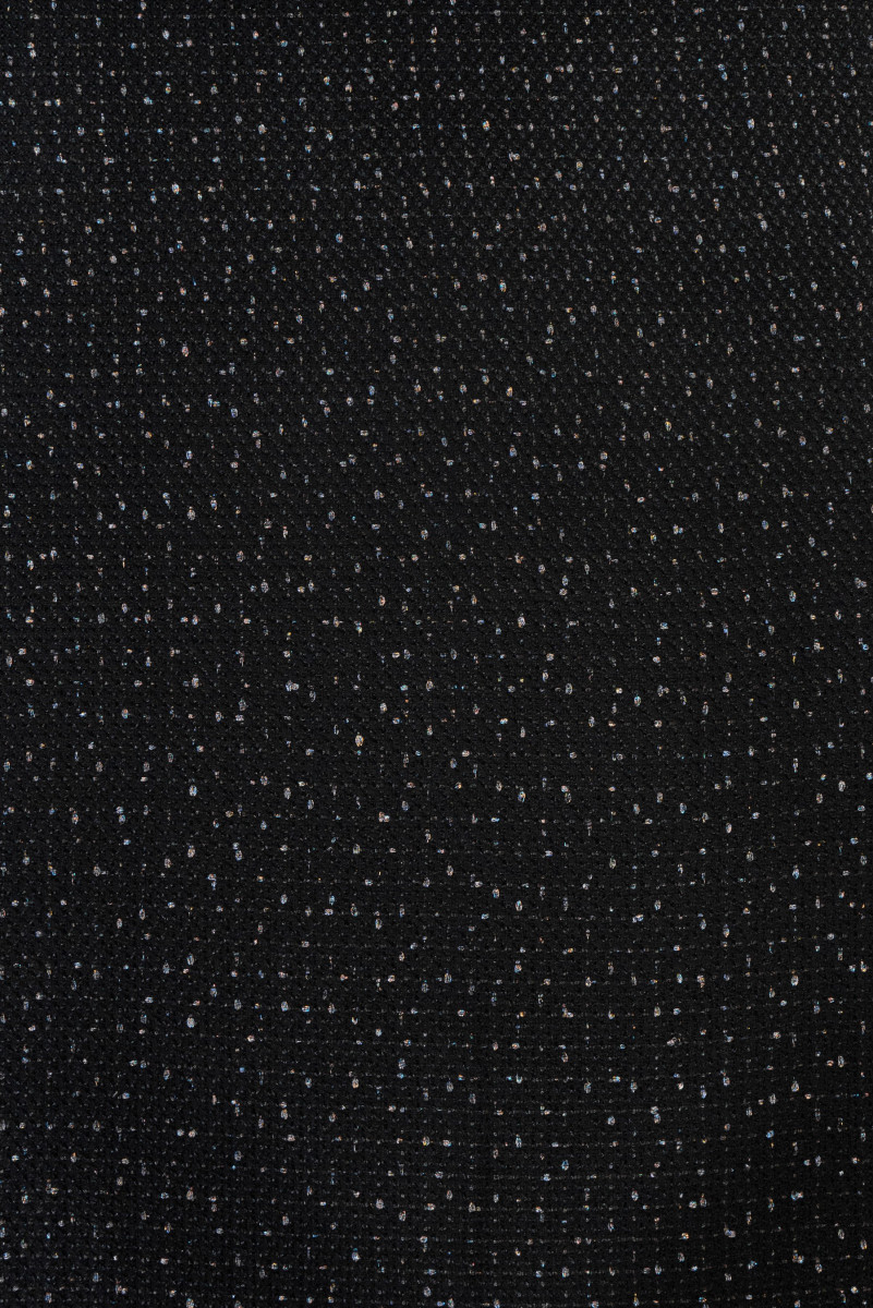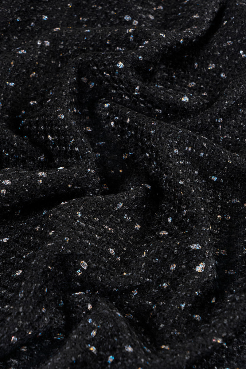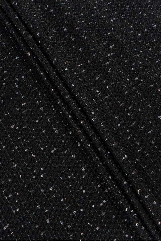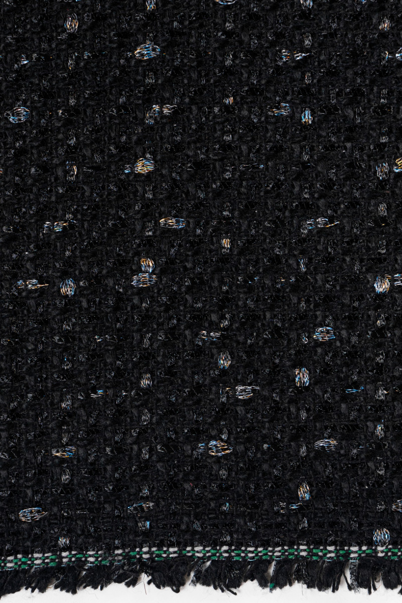 Itališkas chanel kostiumo audinys juodos spalvos, dekoruotas lurekso siūlais sidabro ir įvairiaspalviais. Minkštas, mėsingas audinys su įdomiu pynimu.