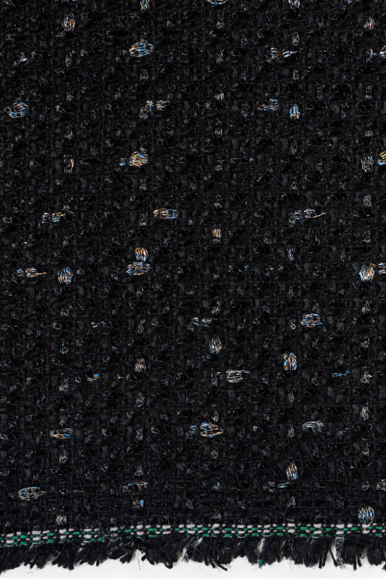 Itališkas chanel kostiumo audinys juodos spalvos, dekoruotas lurekso siūlais sidabro ir įvairiaspalviais. Minkštas, mėsingas audinys su įdomiu pynimu - puikiai tinka kostiumo, suknelės, sijono, šortų siuvimui.