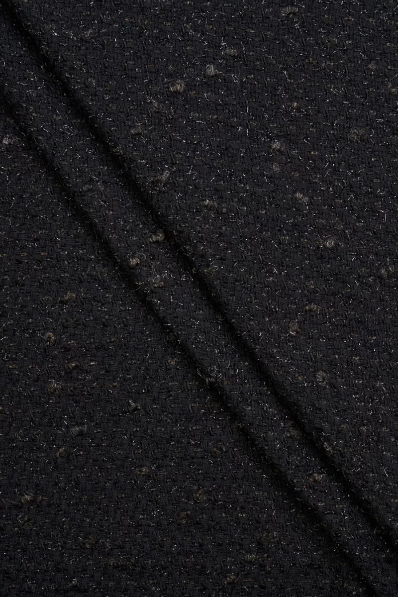 Itališkas chanel kostiumo audinys grietinėlėje su juodu čekiu su lygiu pynimu, papuoštas juodu blizgančiu siūlu. Audinys daugiausia pagamintas iš natūralių pluoštų, todėl jį labai patogu dėvėti, minkštas, o pridėjus sintetinių siūlų, jis tampa patvaresnis ir nesiglamžo. Pasiūlymas žmonėms, kurie mėgsta klasikinį, nesenstantį dizainą. Tinklelio dydis 6cm*6cm.
