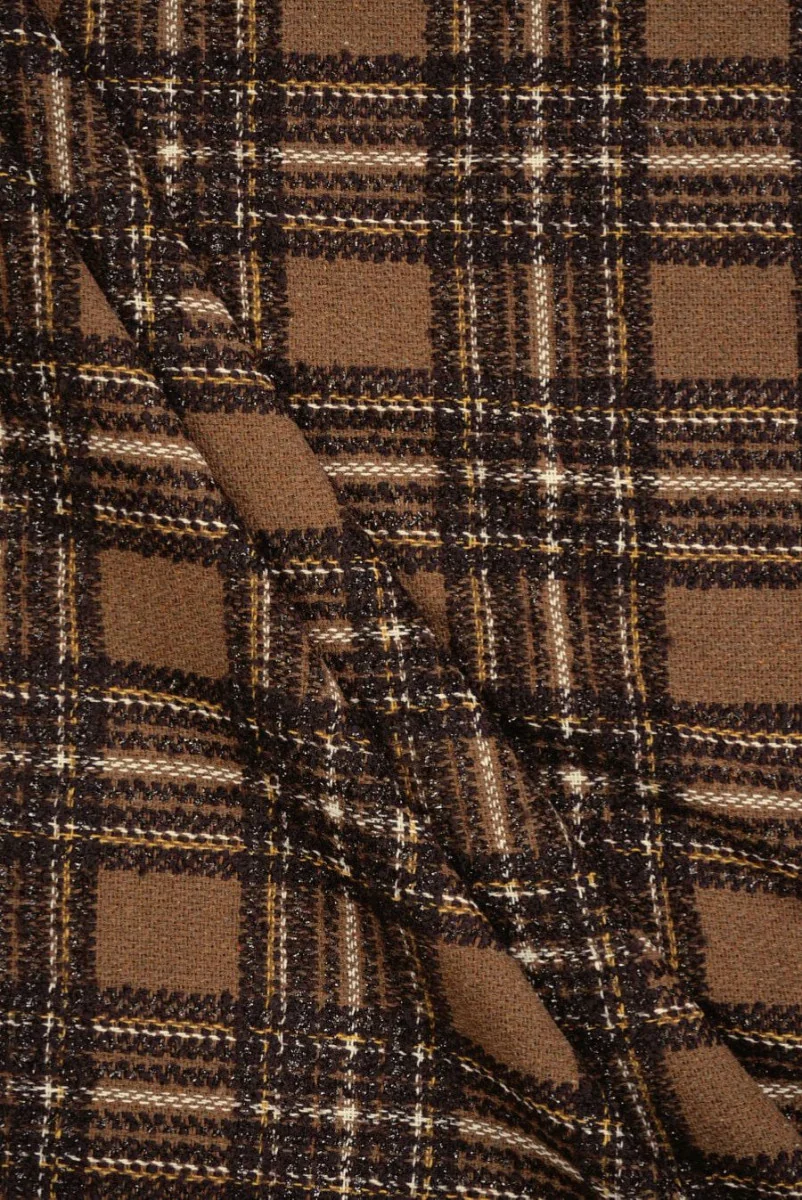 Itališkas chanel kostiumo audinys, austas iš medvilnės ir poliesterio mišinio su rudu languotu motyvu. Reguliariai austos tamsiai rudos juostelės, kurių plotis 7,5 cm, išdėstytos horizontaliai ir vertikaliai, sudaro languotą raštą. Juostelės praturtintos geltonais, kreminiais ir blizgiais, tamsiai rudais siūlais, kurių dėka visa tai atrodo gražiai. Audinys yra mėsingas, minkštas ir nelankstus. Tai puikiai tiks prie švarko, sijono ar suknelės.