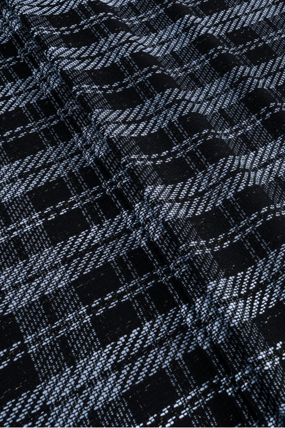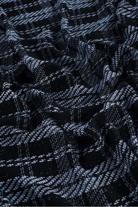 Chanel kostiumo audinys madingas juodas ir mėlynas su aukso lurekso siūlu. Puikiai tinka kostiumų, suknelių, paltų siuvimui.