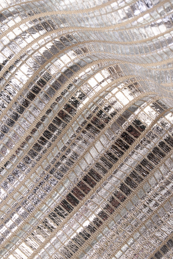 Įspūdingas plisuotas audinys smėlio spalvos su tankiai išdėstytais, mažais, blizgančiais sidabro kvadratais. Audinys yra lengvas, tekantis, intensyviai blizgus, o tai suteikia jam unikalią ir išskirtinę išvaizdą. Puikiai tinka oficialiai aprangai.