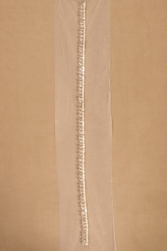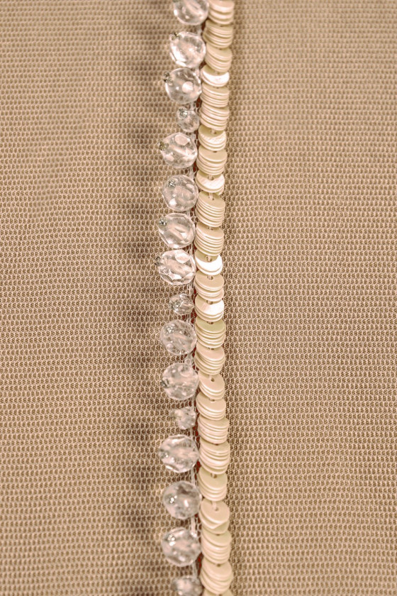 Itališka galanterijos juosta, pagaminta iš didelių skaidrių karoliukų ir abrikosų spalvos blizgučių. Visa tai siuvama ant minkšto tiulio tinklelio.