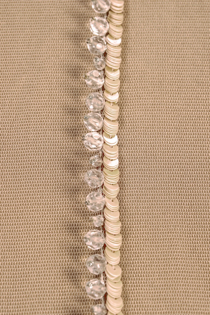 Itališka galanterijos juosta, pagaminta iš didelių skaidrių karoliukų ir abrikosų spalvos blizgučių. Visa tai siuvama ant minkšto tiulio tinklelio. Juosta yra 140 cm ilgio.