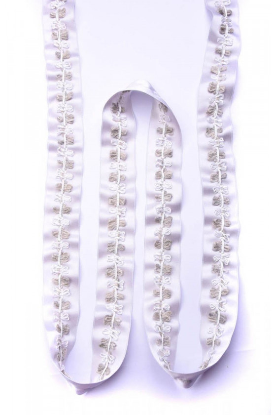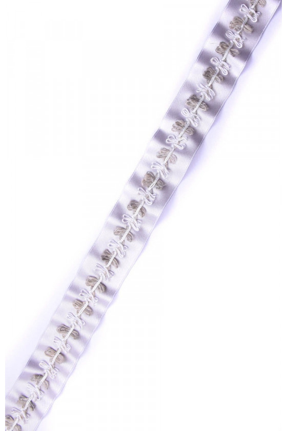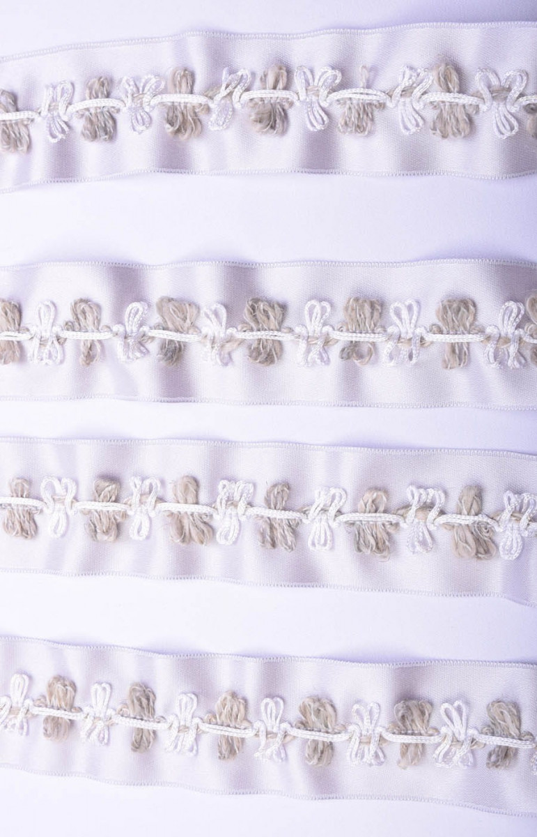 Galanterijos juosta idealiai tinka apdailai ir aksesuarams. Ant šviesiai pilkos juostos, baltos ir alyvuogių kilpos.