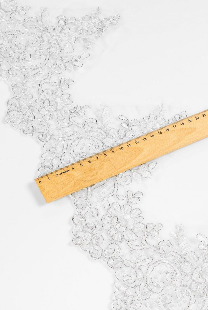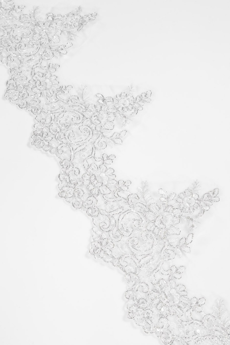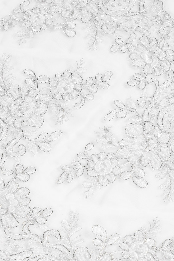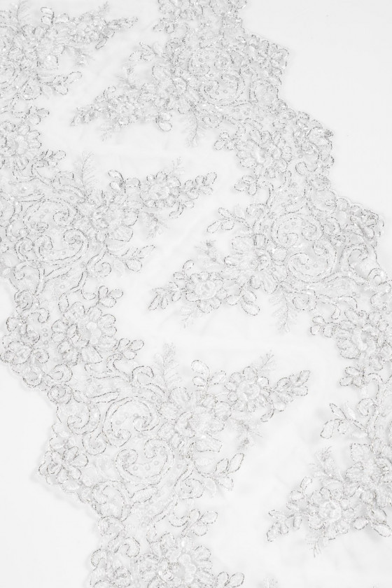 Nėrinių juosta, siuvinėta akmenimis ir blizgučiais. Audinys iš vienos pusės baigtas dantimi. Puikiai tinka vestuvinių suknelių apdailai.