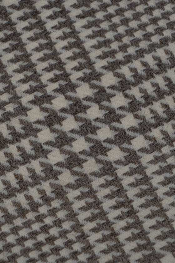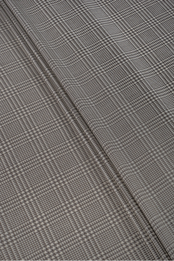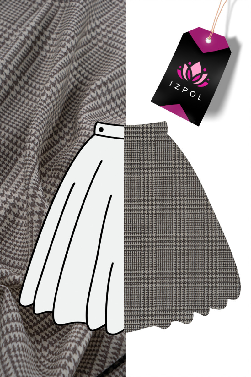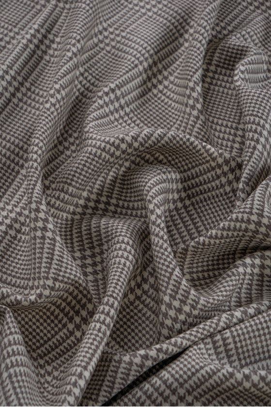 Itališka ecru kostiumo vilna su kontroliniu motyvu ir tamsiai smėlio spalvos vištienos pėda. Mėsingas, neelastingas, matinis rudens-žiemos tipo audinys. Puikiai tinka siūti kostiumą, kelnes, sijoną ar suknelę. Sudėtis: 100% vergino vilna