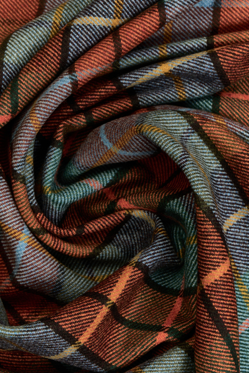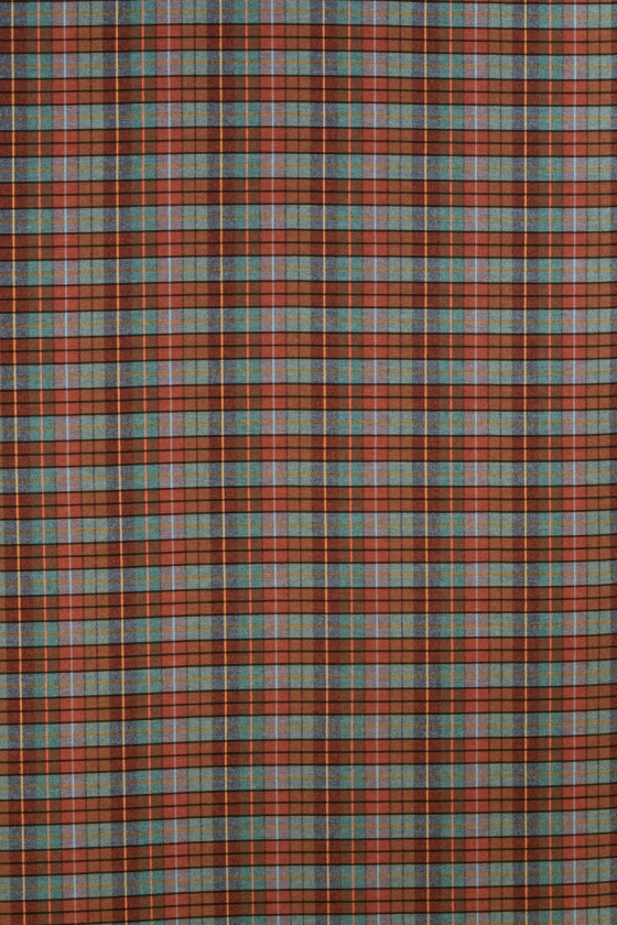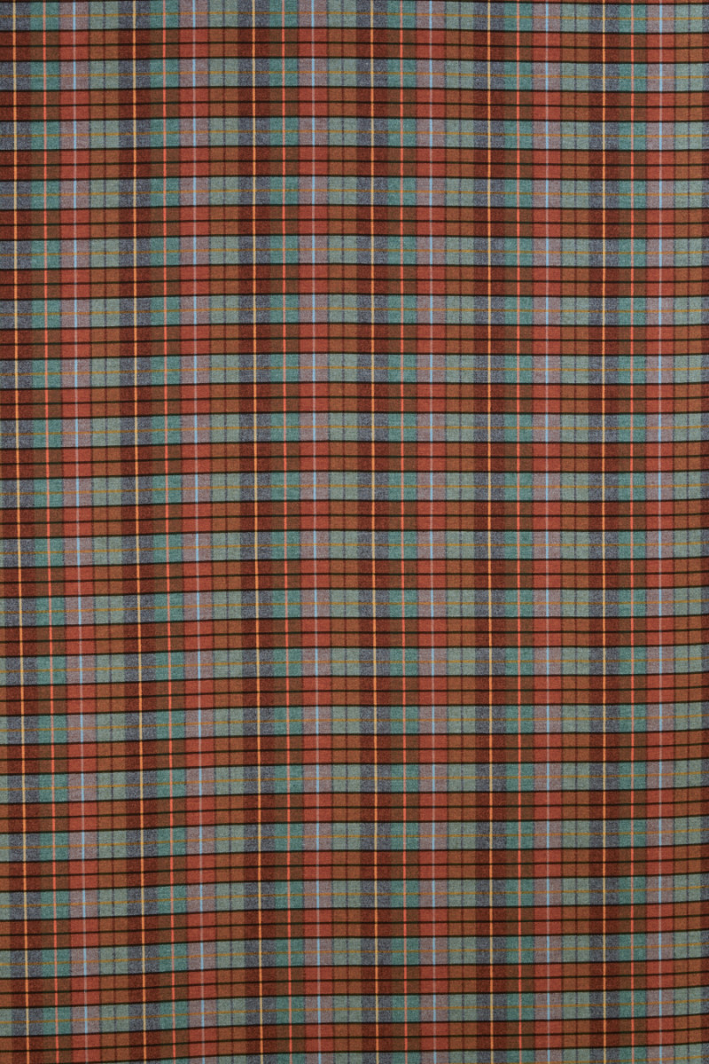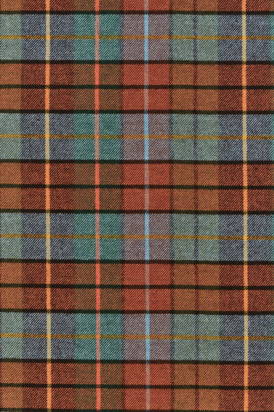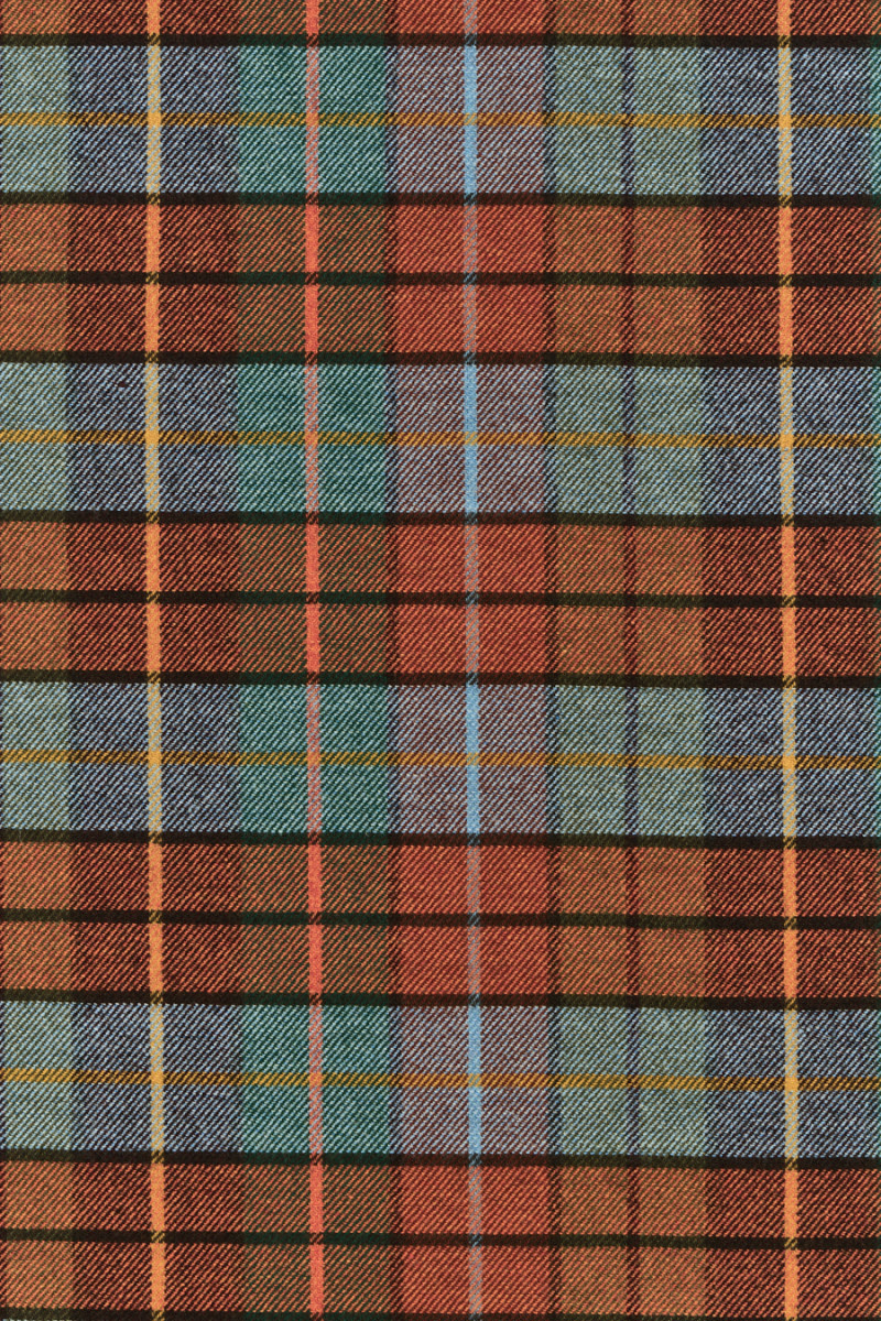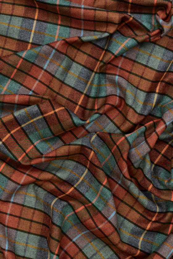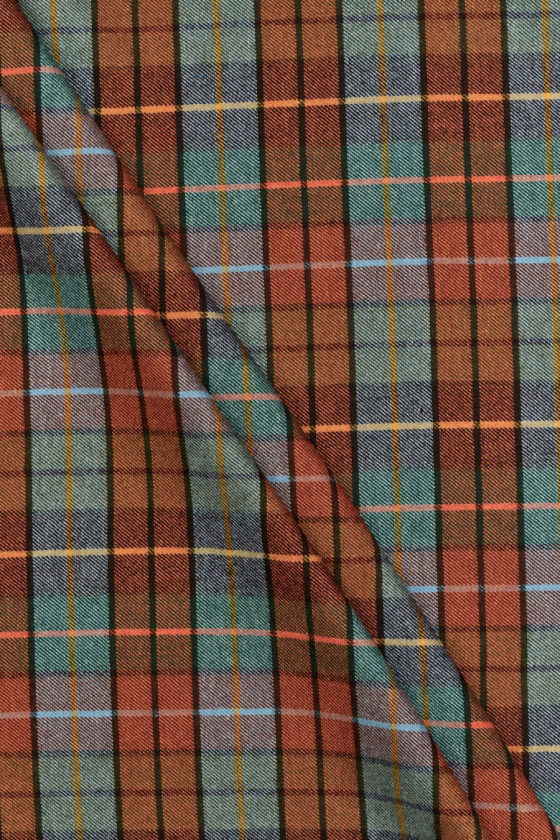 Itališkas kostiuminis audinys iš rudens/žiemos kolekcijos, austas iš vilnos ir poliesterio su languotu motyvu oranžine, mėlyna ir šalavijais. Reguliarus modelis, sudarytas iš kvadratų, išdėstytų vienas šalia kito, kurių dydis yra 2 cm * 2 cm. Audinys yra vidutinio storio, minkštas, malonus liesti ir lankstus. Jis pagamintas subtiliu pynimu. Nesenstantis pasiūlymas, kuris puikiai tiks siūti sijoną, suknelę, taip pat kelnes ir švarką.