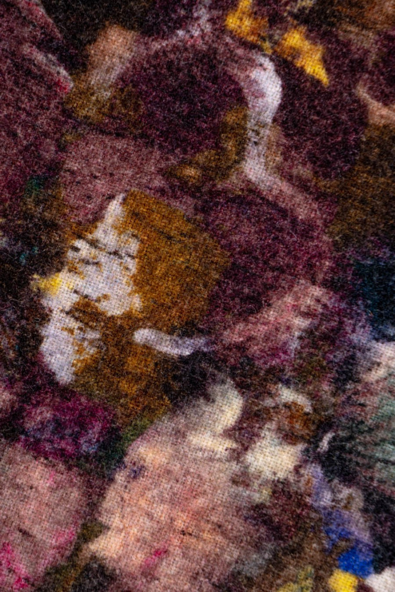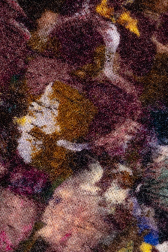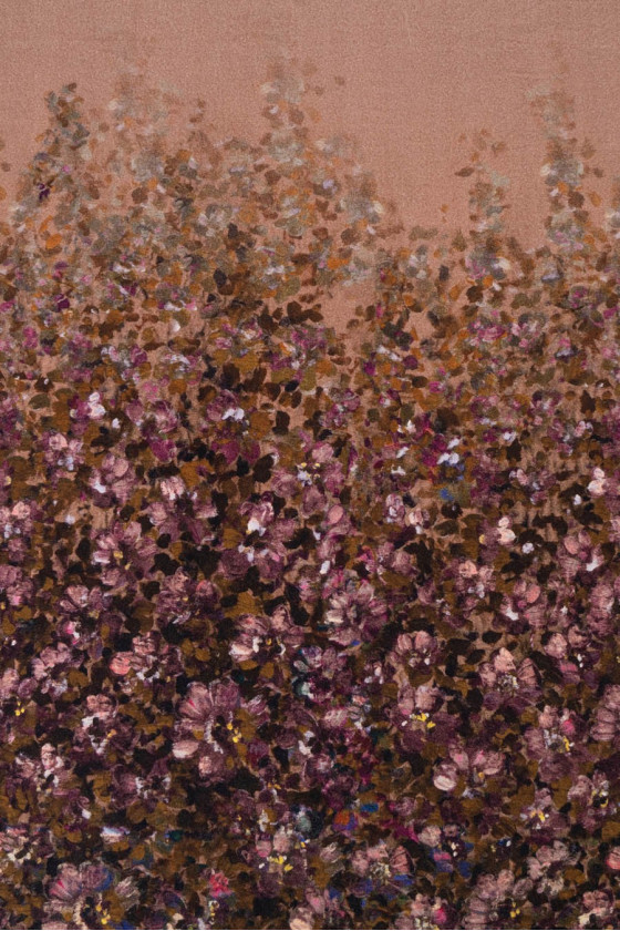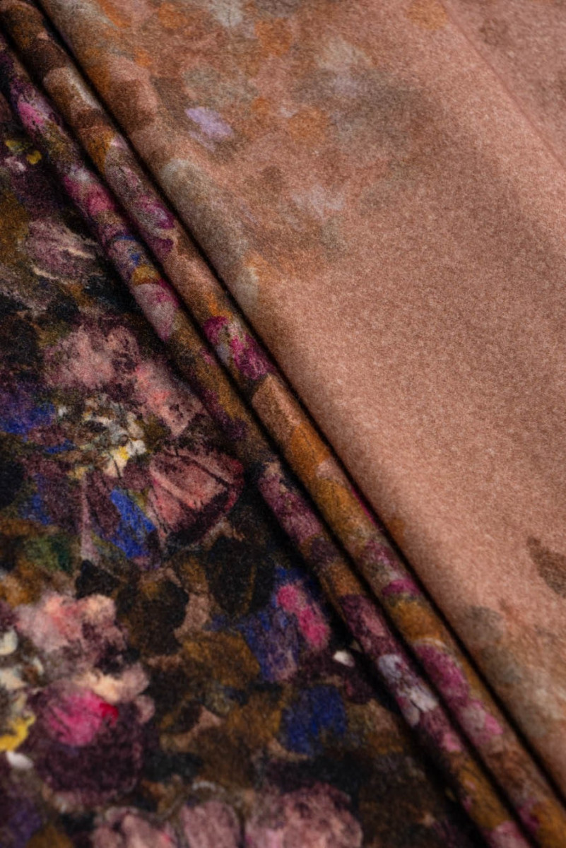Itališkas gėlių kostiumų audinys rožinės, violetinės ir rudos spalvos atspalviais. Austi iš 85% natūralios vilnos ir 15% poliamido. Vilnoniai audiniai idealiai tinka žieminiams drabužiams, nes jie šildo ir tuo pačiu leidžia odai kvėpuoti. Puikiai tinka suknelės ar kostiumo siuvimui. Audinys siuvamas perimetru.