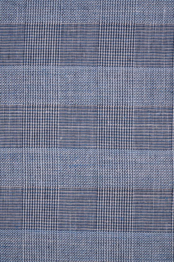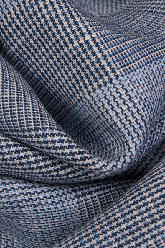 Itališkas lininis ir medvilninis audinys su kontroliniu raštu, dydis 4 cm * 4 cm. Audinys pagamintas iš mėlynos, baltos ir tamsiai mėlynos spalvos siūlų. Jis yra plonas, neelastingas, šiek tiek laisvas pynimas. Puikus pasiūlymas vasarai, iš kurio galite sugalvoti švarką, suknelę, sijoną.
