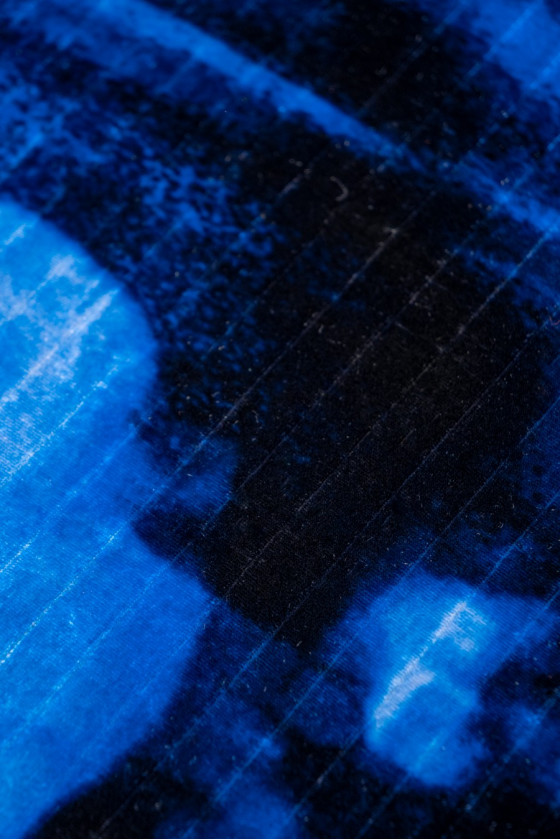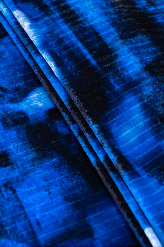 Itališkas viskozės veliūras su nailono priedu tamsiai mėlynos spalvos su tamsesnių (suteptų) gėlių motyvu. Audinys austas subtilia juostele, apie 1 cm pločio. Audinys yra labai subtilus liesti, švelniai užuolaidos, stabilus. Mes rekomenduojame jį elegantiškiems drabužiams - suknelėms, sijonams, kelnėms, tunikoms ir dekoratyviniam audiniui.