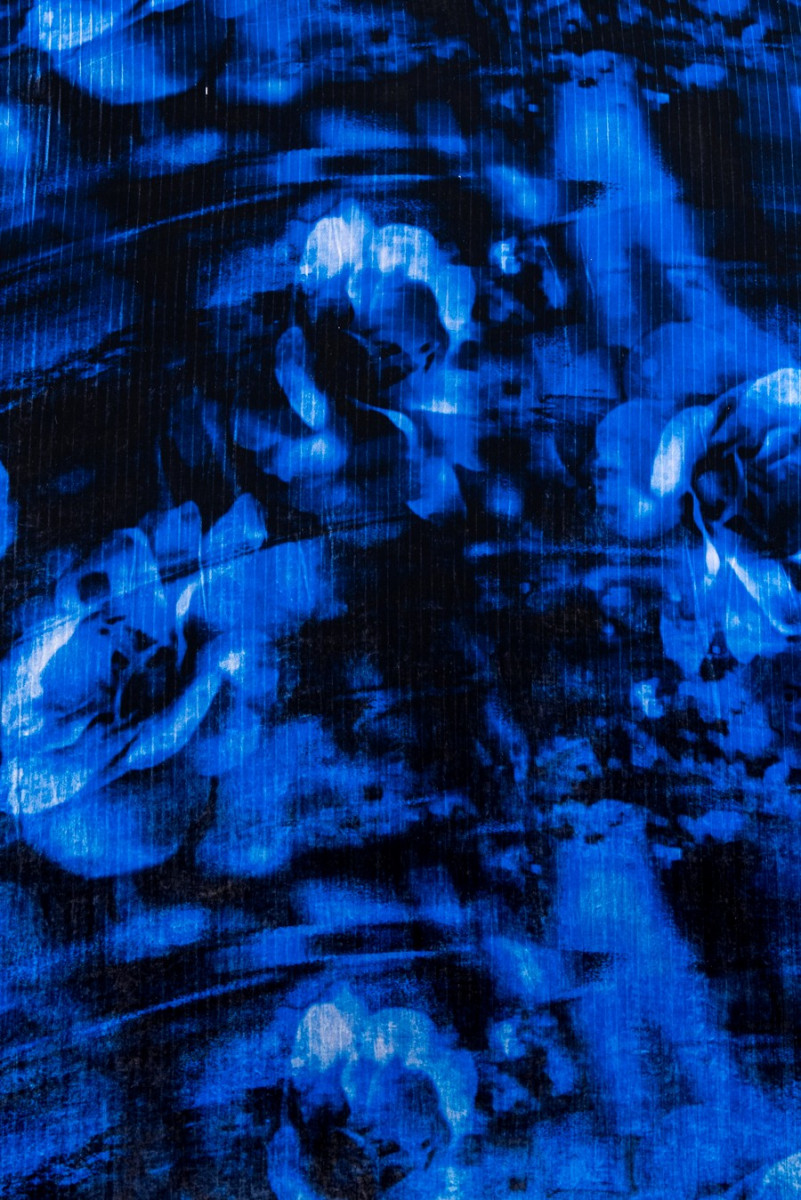 Itališkas viskozės veliūras su nailono priedu tamsiai mėlynos spalvos su tamsesnių (suteptų) gėlių motyvu. Audinys austas subtilia juostele, apie 1 cm pločio,