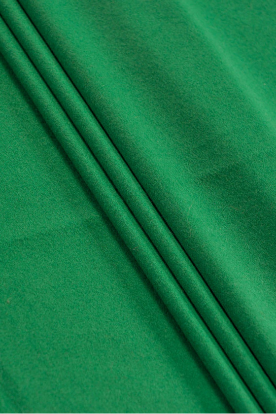 Itališkas, plonesnis žalios spalvos kailio audinys, austas iš 75% natūralios vilnos, 15% kašmyro ir 10% poliamido. Vilnoniai audiniai idealiai tinka viršutiniams drabužiams (paltui, striukei, liemenei), nes jie šildo ir tuo pačiu leidžia odai kvėpuoti. Pridėjus kašmyro, jis dar geriau izoliuojamas, nes kašmyras yra šiltesnis nei avių vilna.