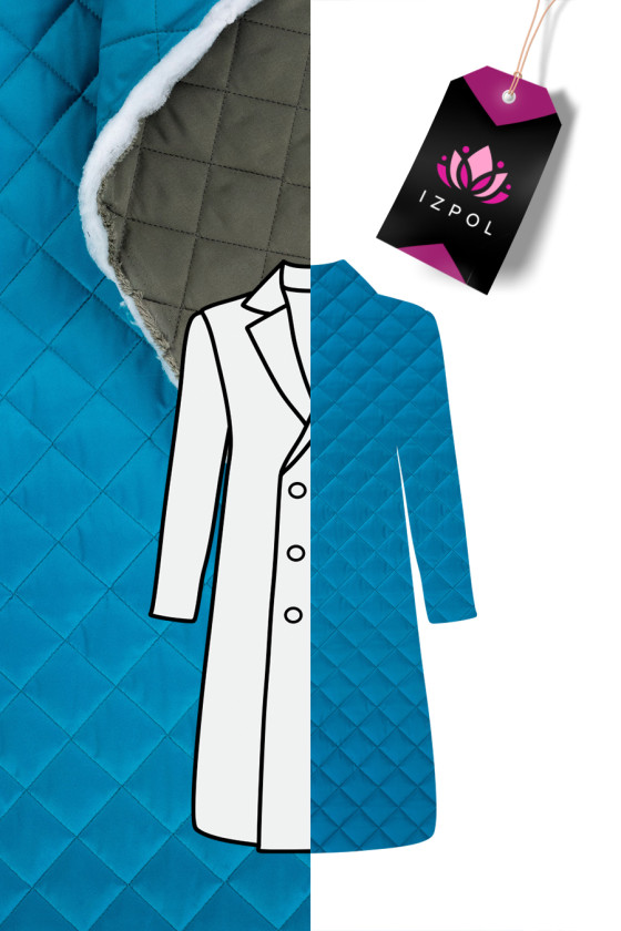 Itališkas švarko audinys su dygsniavimo motyvu (5cm) - dvipusis, iš vienos pusės mėlynos spalvos, o kitoje - chaki. Audinys užpildytas poliesterio izoliacija.