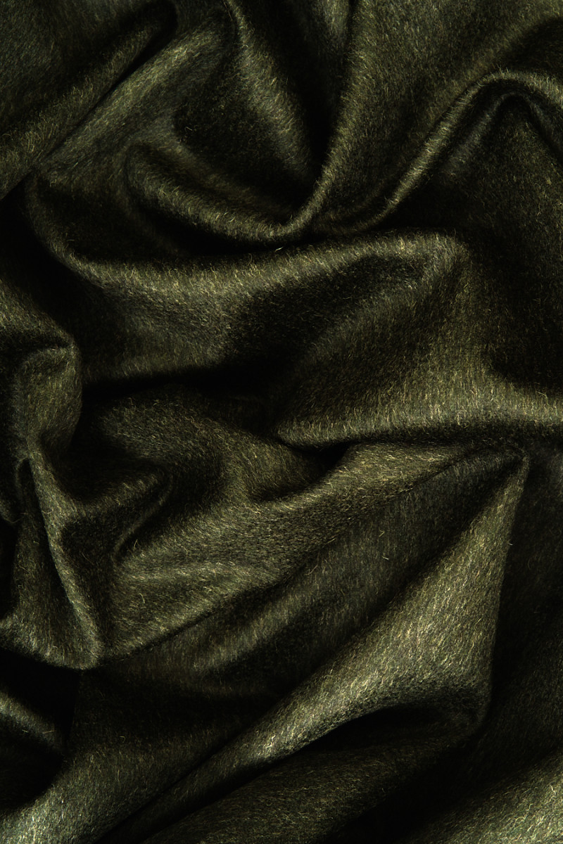 Itališka vergino vilna tamsiai žalia, kuri yra sulaužyta šviesesniais plaukais. Labai minkštas, kilnus audinys, turintis subtilų blizgesį ir trumpesnę, presuotą krūvą, puikiai tinka rudens-žiemos palto, striukės ar šiltos liemenės siuvimui. Dėl geriausios kokybės kompozicijos audinys ne tik atrodo gražiai, bet ir yra labai šiltas. Audinys puikiai tinka žmonėms, kurie mėgsta aukščiausio leidimo klasiką.