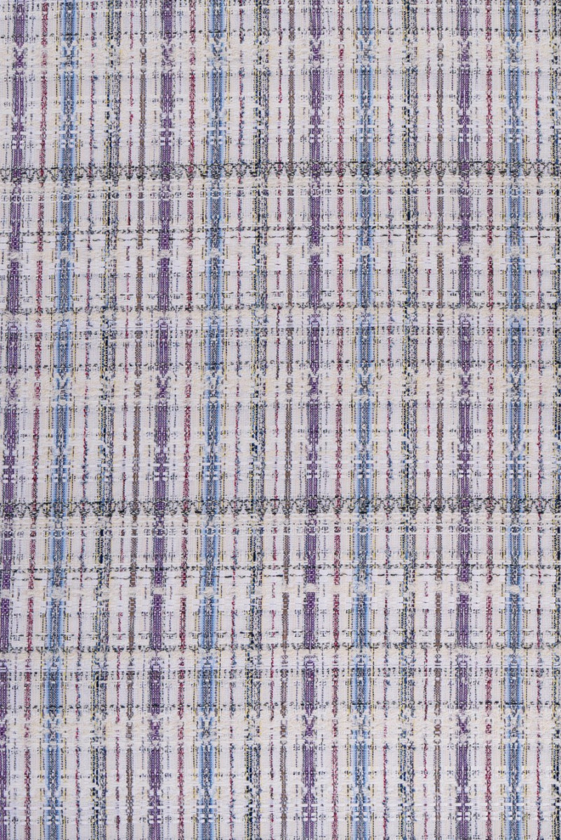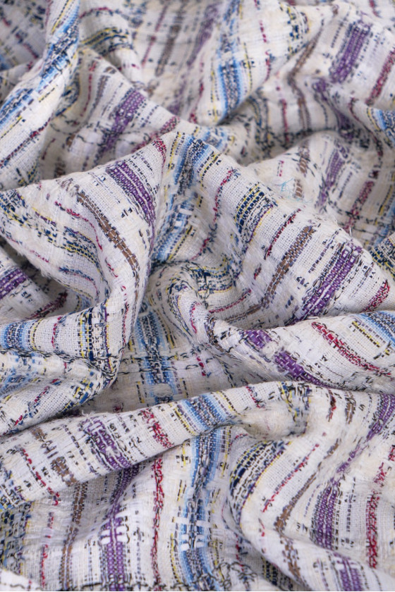 Išskirtinis chanel audinys originalių striukių ar plonų paltų siuvimui. Spalvos: įvairiaspalviai siūlai netaisyklingai įsipainioja į baltą metmenį.