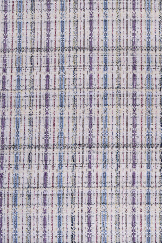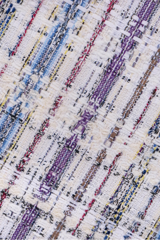 Išskirtinis chanel audinys originalių striukių ar plonų paltų siuvimui. Spalvos: įvairiaspalviai siūlai netaisyklingai įsipainioja į baltą metmenį. Audinys austas iš daugelio siūlų.