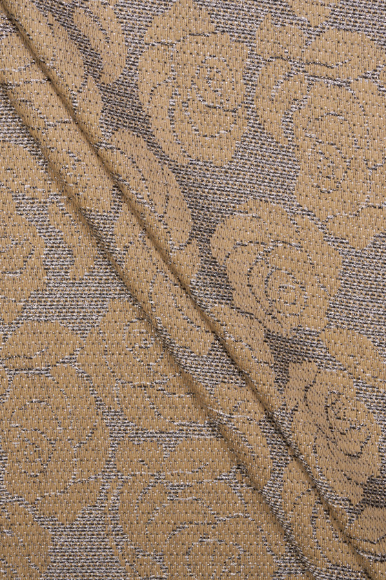 Itališkas chanel kostiumo audinys smėlio spalvos su sidabro rožių gėlių motyvu. Minkštas audinys su laisvesniu pynimu - jis gali būti siuvamas iš abiejų pusių. Puikiai tinka ploniems paltams, kostiumams ir sijonams.