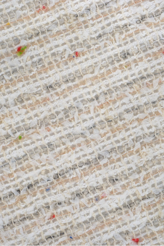 Suknelės audinys su laisvu pynimu, kaip tinklas, skirtas pavasario suknelėms grietinėlės spalvos, labai šviesiai smėlio spalvos su subtiliais, spalvingais akcentais.