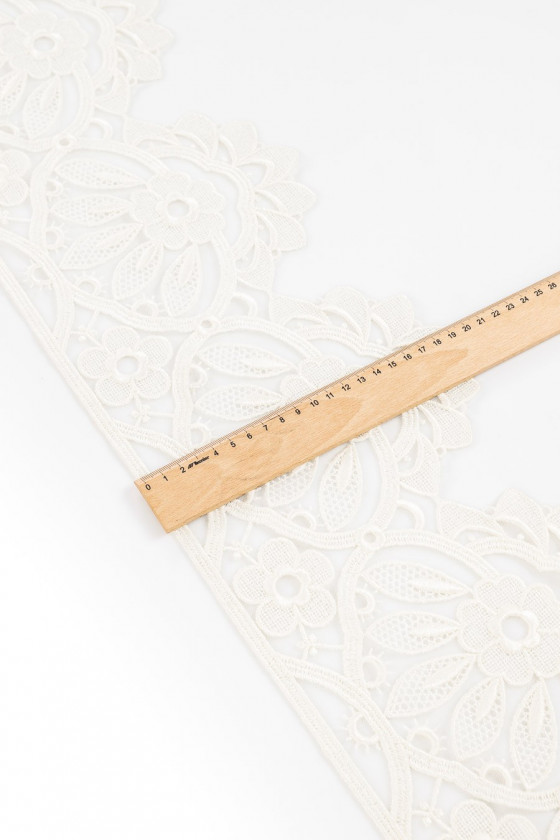 Itališka gipiūro juosta ecru spalva. Gražus gėlių motyvas ant lengvo tiulio tinklelio. Baigta su dantimi vienoje pusėje. Plotis: 20 cm.