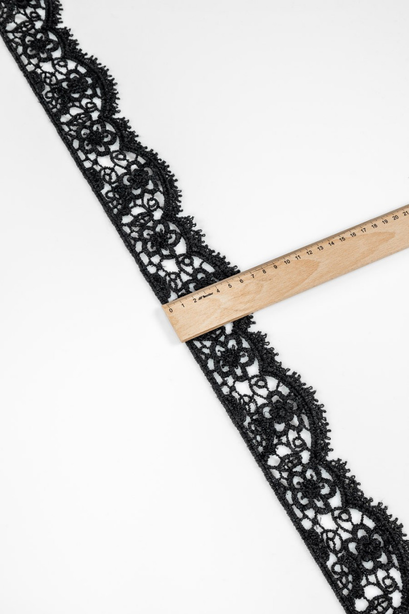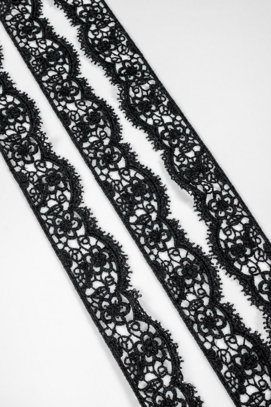 Grafito spalvos gipiūro juosta, susipynusi su lurekso siūlu. Puikiai tinka suknelių ir sijonų apdailai.