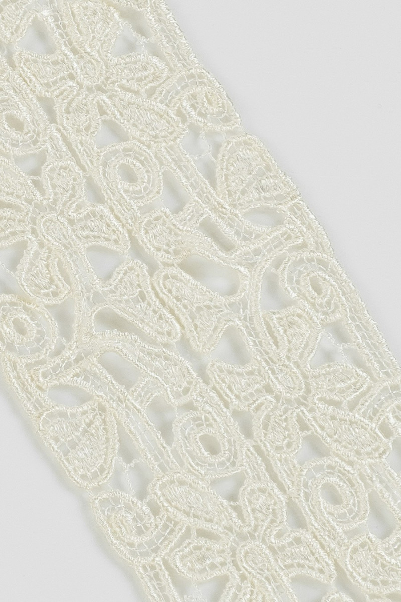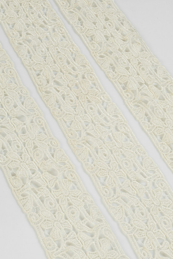Galanterijos juosta iš gipiūrinių nėrinių, apie 10 cm pločio. Paskirtis: apdailos suknelės, vestuvinės suknelės.