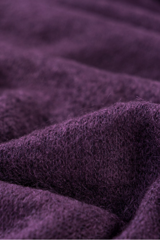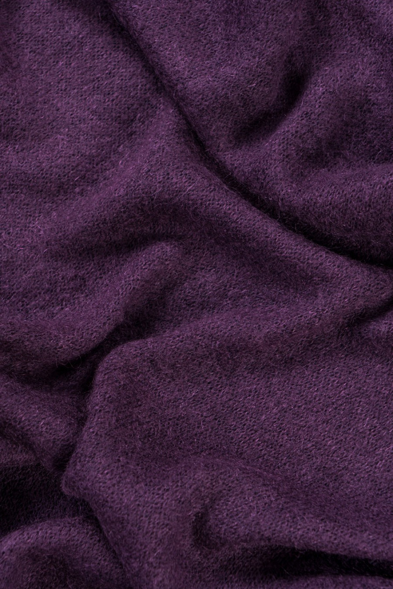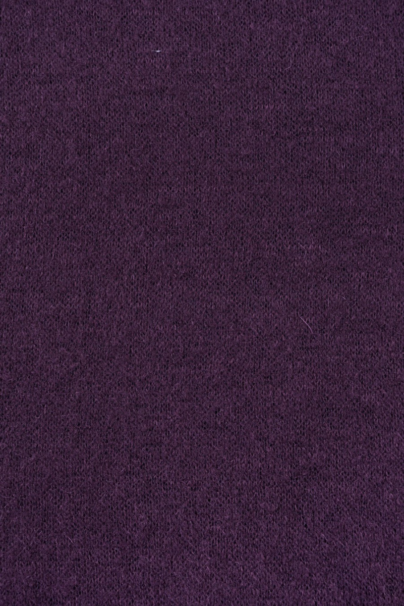 Itališkas megztinis megztas audinys labai geros kokybės, austas iš vilnos, akrilo ir moheros tamsiai violetinės spalvos.