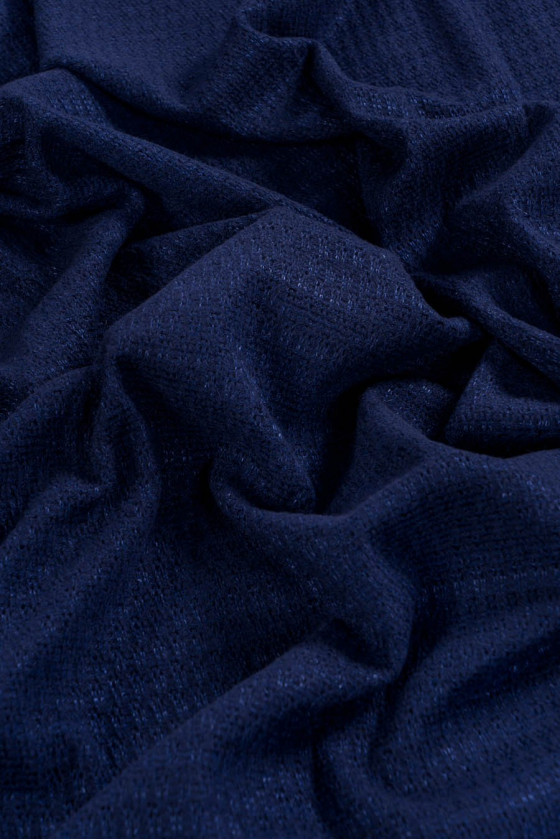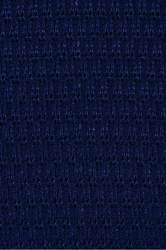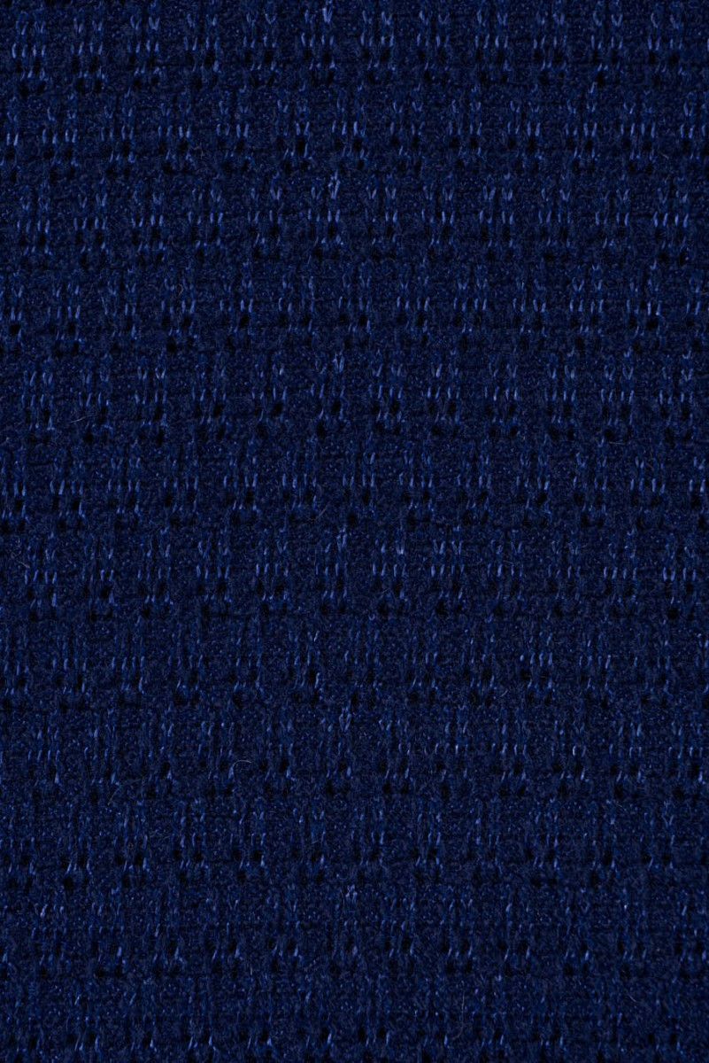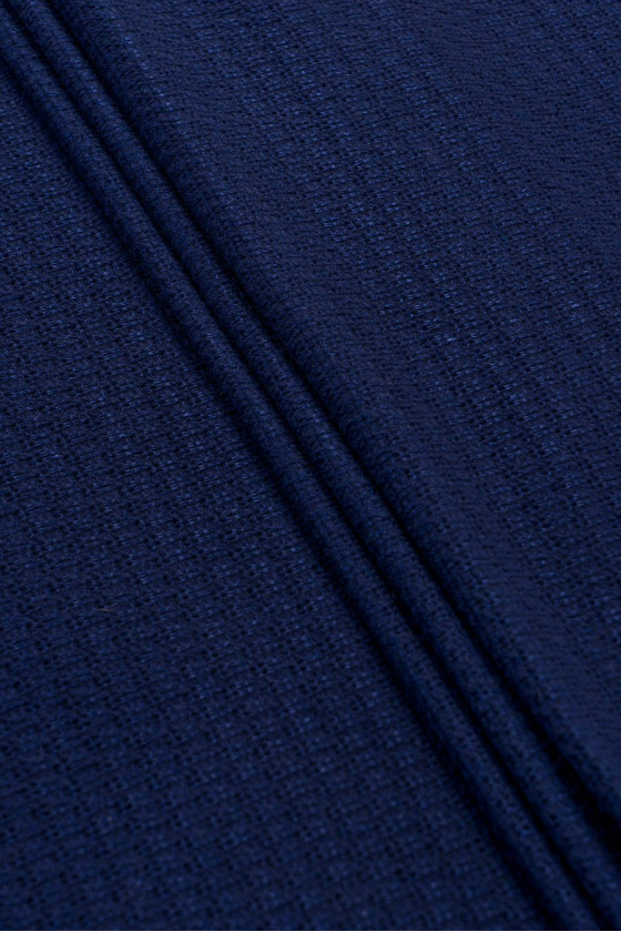 Tamsiai tamsiai mėlynas megztinis megztas audinys su laisvu ažūriniu pynimu, labai kaliojo. Audinys sudarytas iš vilnos ir akrilo siūlų. Rekomenduojame siūti megztinius, megztinius, šalikus.