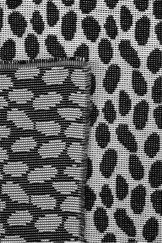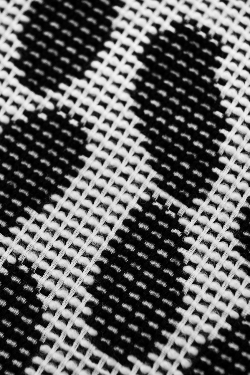 Itališkas dvipusis audinys su baltais ir juodais pleistrais, austas iš natūralios vilnos su poliesterio mišiniu.