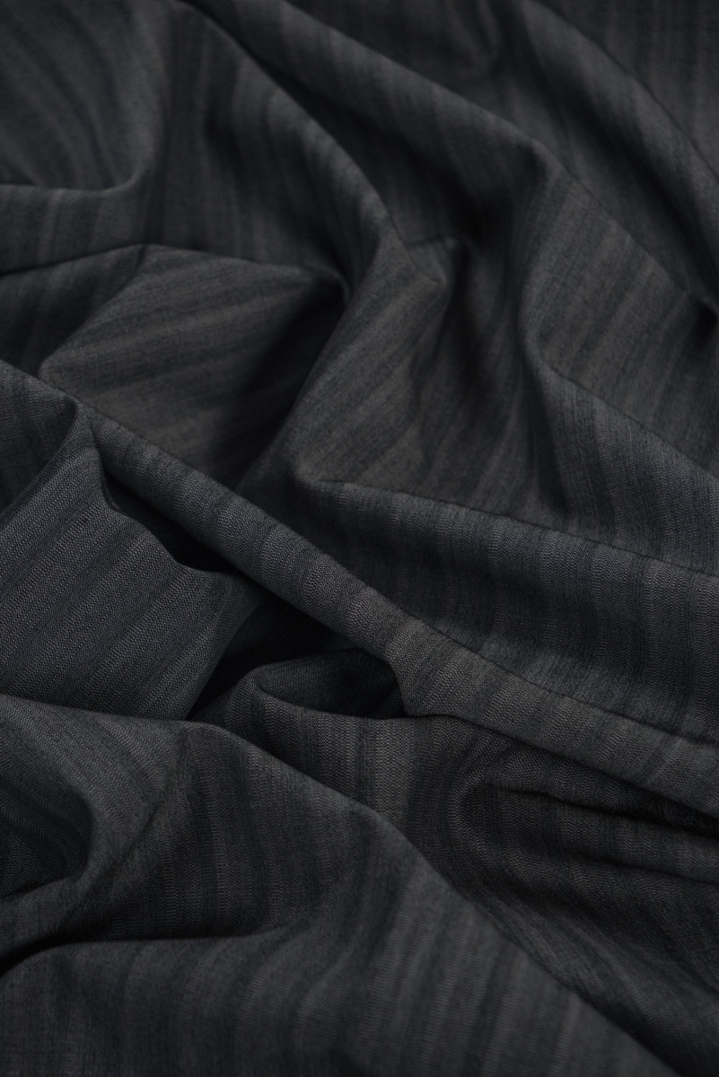 Itališka kostiumų vilna su juostelėmis, 2 cm pločio juoda ir pilka - dviejų tonų. Minkštas, mėsingas, neelastingas audinys.