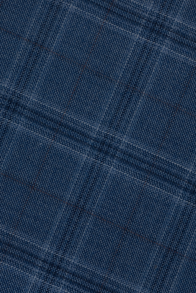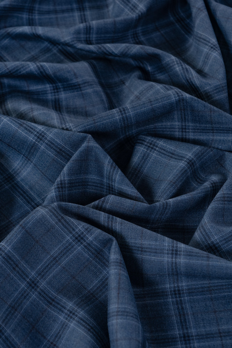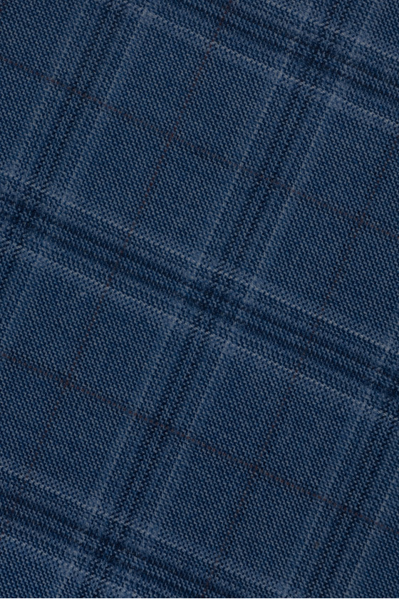 Itališka kostiumo vilna šviesiai tamsiai mėlyna su 5 cm pločio lango motyvu. Minkštas, neelastingas audinys su klasikiniu pynimu.