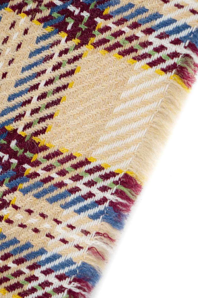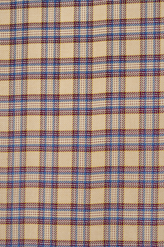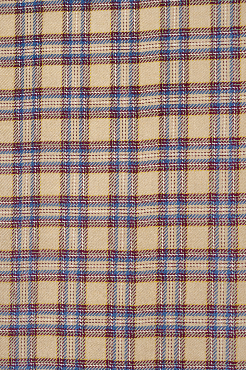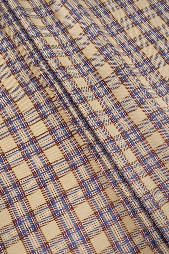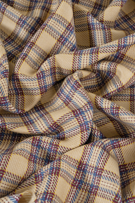 Itališka kostiumo vilna šviesiai smėlio spalvos su maždaug 5 cm pločio lango motyvu, bordo, mėlynos ir écru. Storesnis, minkštas, neelastingas rudens-žiemos tipo audinys su plačiu, pynimu. Fantastiškas pasiūlymas žmonėms, kurie mėgsta ramias spalvas, bet originalius spalvų derinius. Audinys puikiai tinka švarko, sijono ar suknelės siuvimui.