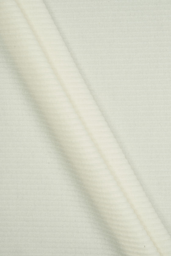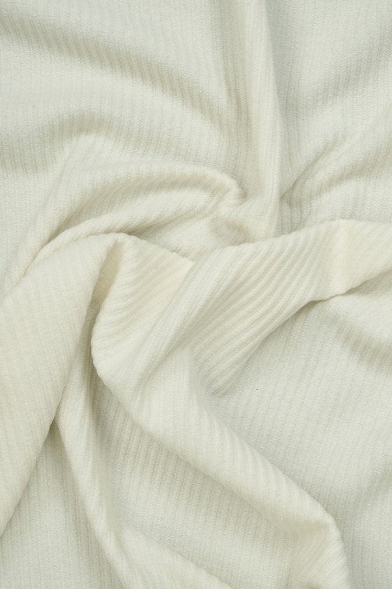 Itališkas kreminės spalvos megztinio audinys, austas iš vergino vilnos su poliamido ir viskozės mišiniu. Labai mėsingas audinys su 0,5 cm pločio šonkaulių pynimu. Vilna tampa labai šilta, o poliamido mišinys suteikia jai ilgaamžiškumo. Puikus pasiūlymas siuvant rudens-žiemos megztinį, megztinį ar pončą, jis taip pat puikiai tiks kaip dekoratyvinis audinys.