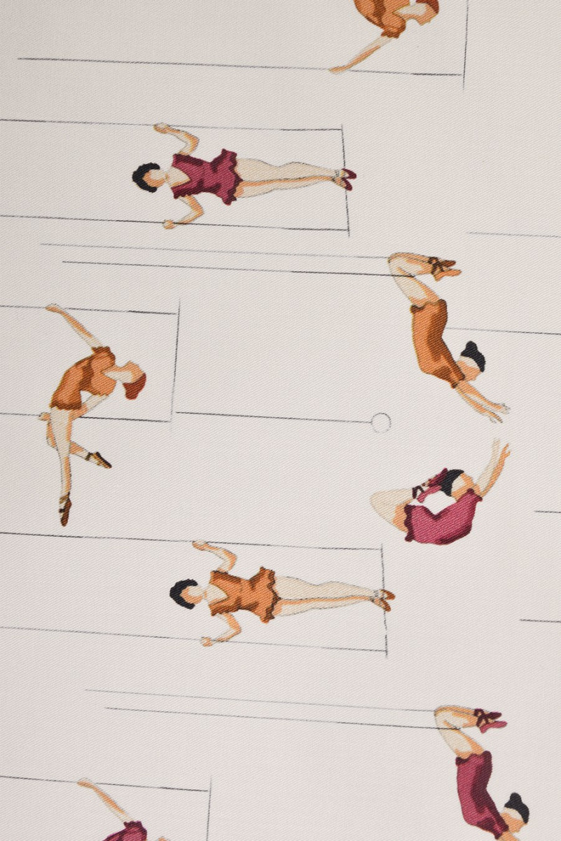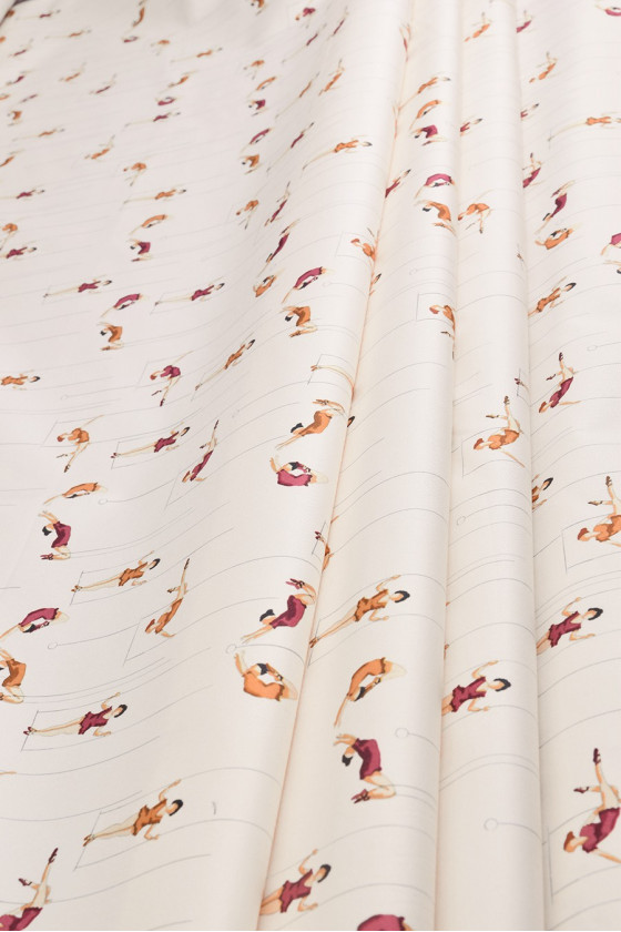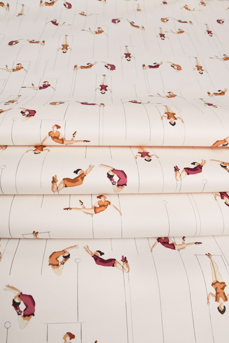 Elastingas medvilninis ecru su originaliu akrobatų modeliu (daugybė figūrų apie 5 cm). Audinio svoris puikiai tinka suknelėms, sijonams, kelnėms ar dekoracijoms