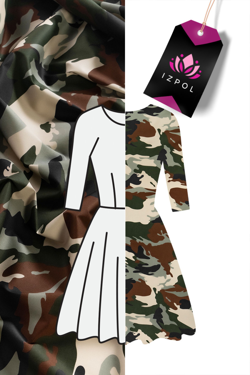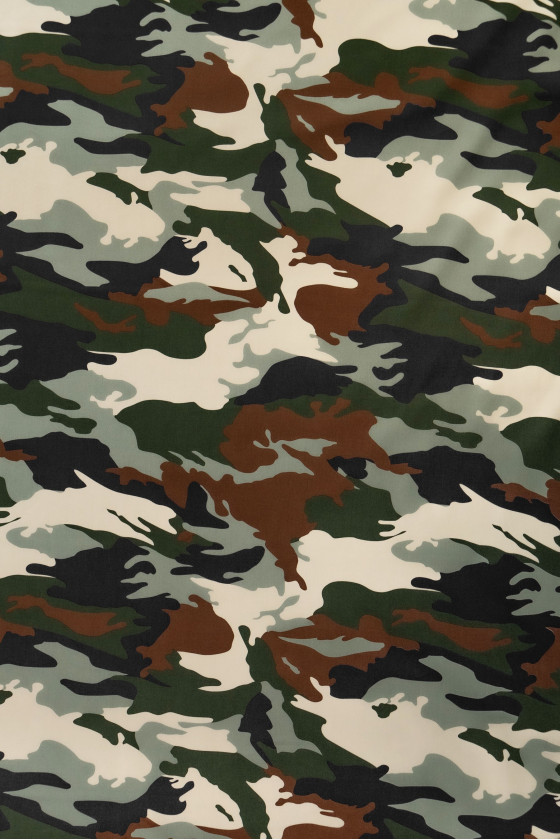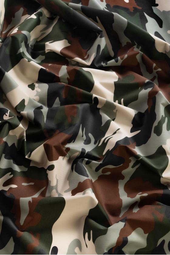 Itališkas medvilninis audinys su camo motyvu. Medvilnė yra 100% natūralus pluoštas. Medvilniniai audiniai yra patvarūs, greitai nenusidėvi, ilgą laiką išlaiko savo savybes, puikiai kvėpuoja, kvėpuoja, o tai suteikia didelį naudojimo komfortą. Plonesnis, elastingas, šiek tiek standus audinys, skirtas marškiniams, suknelėms ar sijonams.