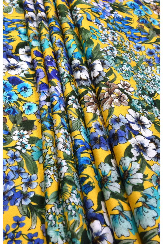 Suknelė viskozė su spalvinga pievomis, minkšta ir gerai aptraukta, vidutinio storio. Rekomenduojame iš jo siūti vasarines sukneles, palaidines ir sijonus. Jis nėra matomas, galite siūti jį be pamušalo. Labai geros kokybės audinys. Gramatažas taip pat tinka moteriškų marškinių siuvimui. Prieš siuvant rekomenduojame iš anksto susitraukti, nes viskozės audiniai gali būti linkę susitraukti. Spalvos: geltoname fone - baltos, violetinės, mėlynos gėlės.