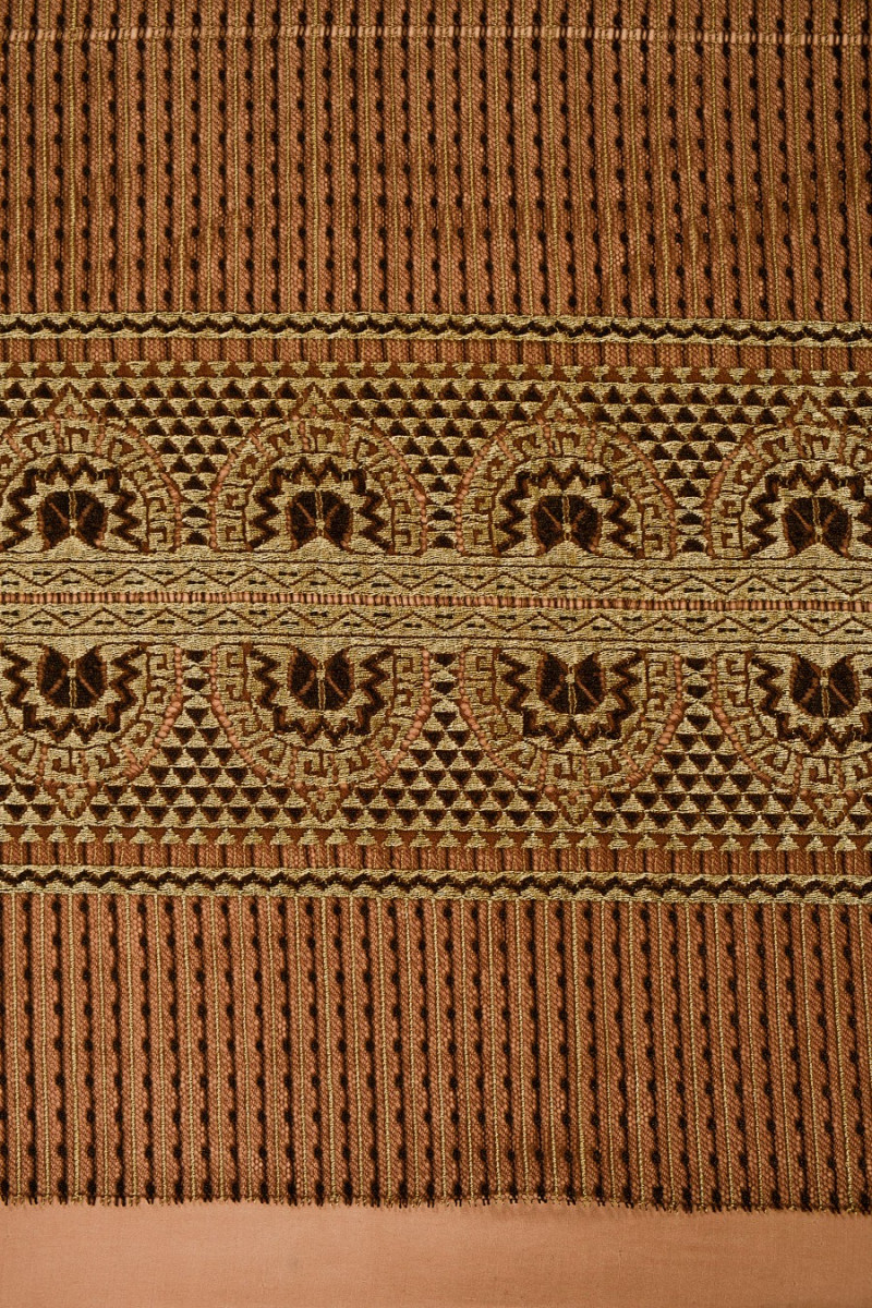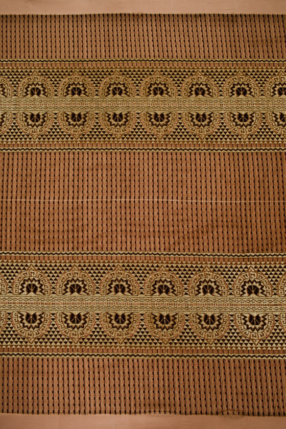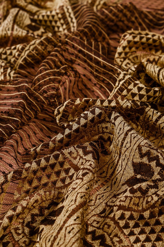Originalūs prancūziški nėriniai rudos spalvos su dvipusiu diržu su 23 cm pločio alyvuogių siūlais. Audinys yra 90 cm pločio.