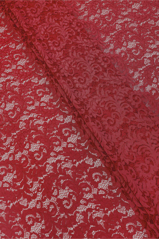 Italijos nėriniai tamsiai raudonos spalvos. Audinys turi tankų gėlių motyvą, sujungtą su tinkleliu ir baigtą virvele. Karūna iš abiejų pusių baigiama dekoratyviniu dantimi - mes siuvame jį perimetru. Labai gražus pasiūlymas žmonėms, kurie mėgsta klasikines spalvas.