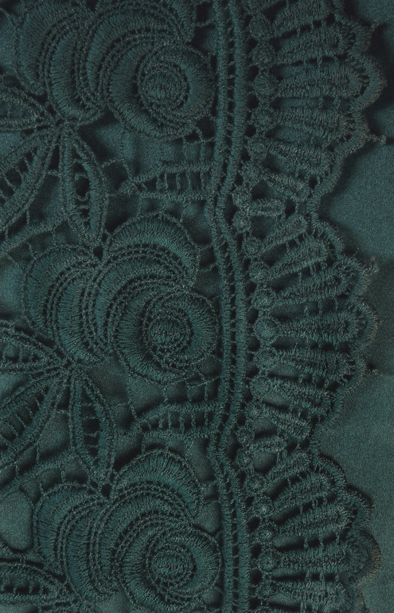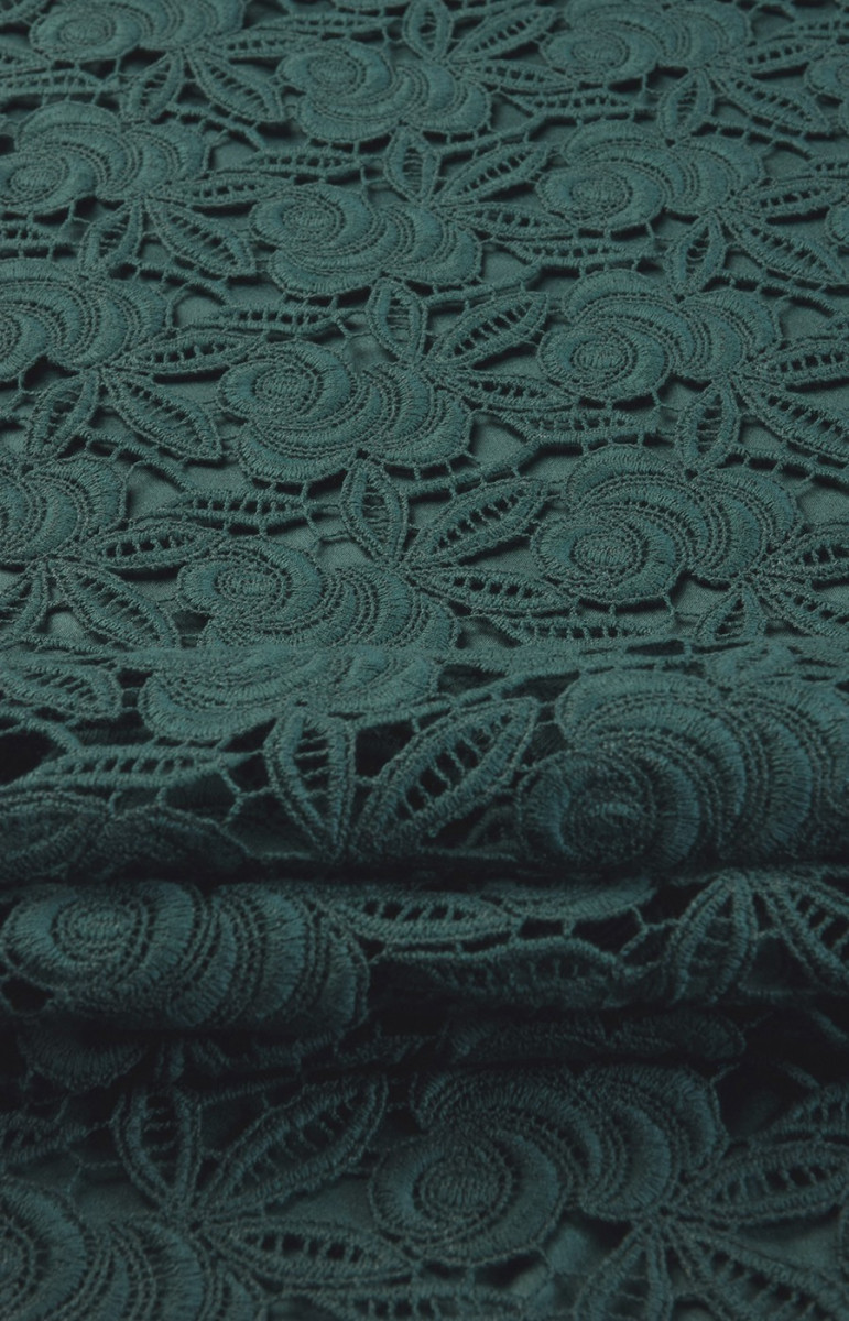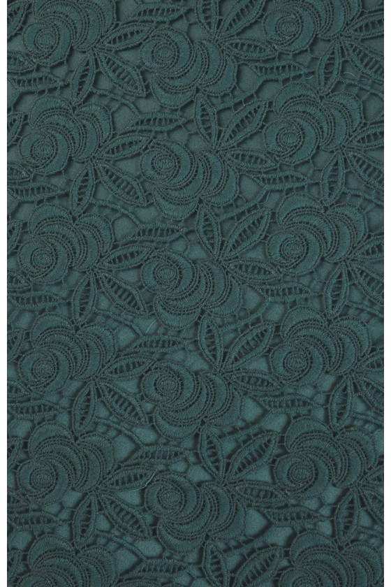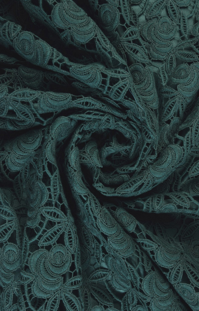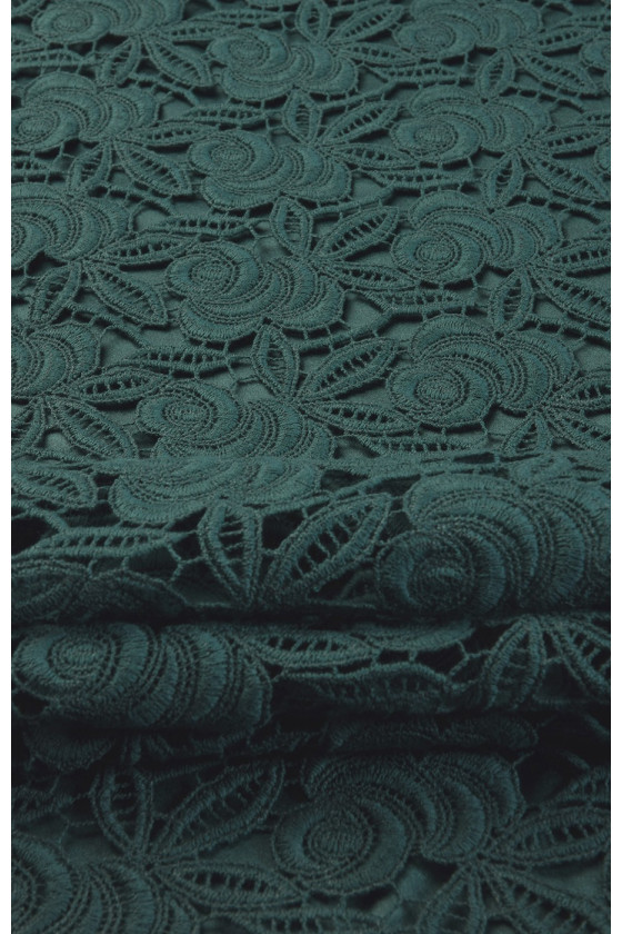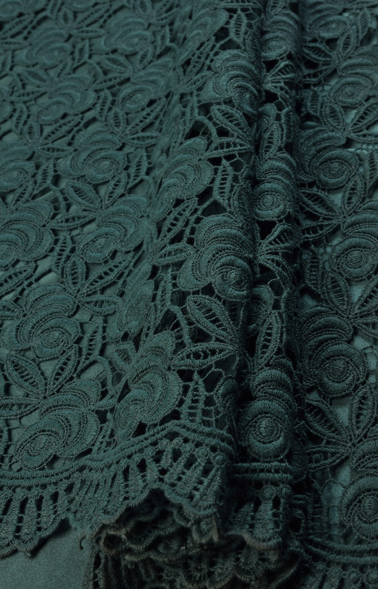 Guipure nėriniai su klasikiniu jūros žalios spalvos modeliu. Norint gražaus efekto, rekomenduojame rinktis pamušalą, pvz., pagamintą iš šilko satino.