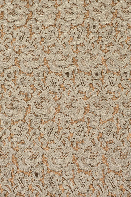 Gupure nėriniai su klasikiniu gėlių modeliu šaltos smėlio spalvos. Norint gražaus efekto, rekomenduojame rinktis pamušalą, pvz., pagamintą iš šilko satino.