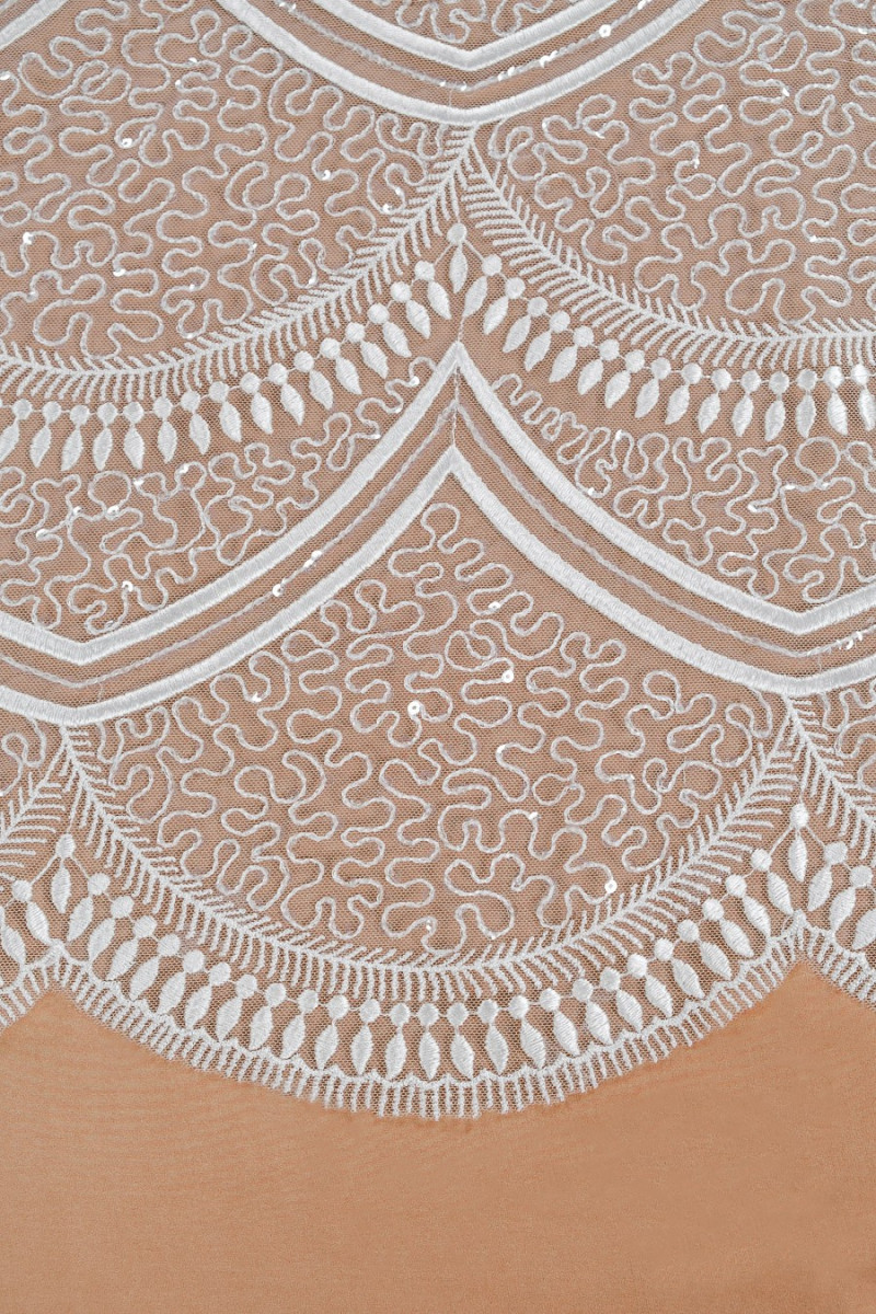 Gražus beveik baltas vainikėlis su danties apdaila vienoje pusėje. Dantis yra apie 20 cm pločio. Siuvinėtas karoliukais ir blizgučiais. Audinys puikiai tinka vestuvinėms suknelėms ir palaidinėms.