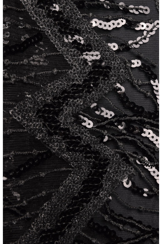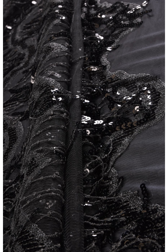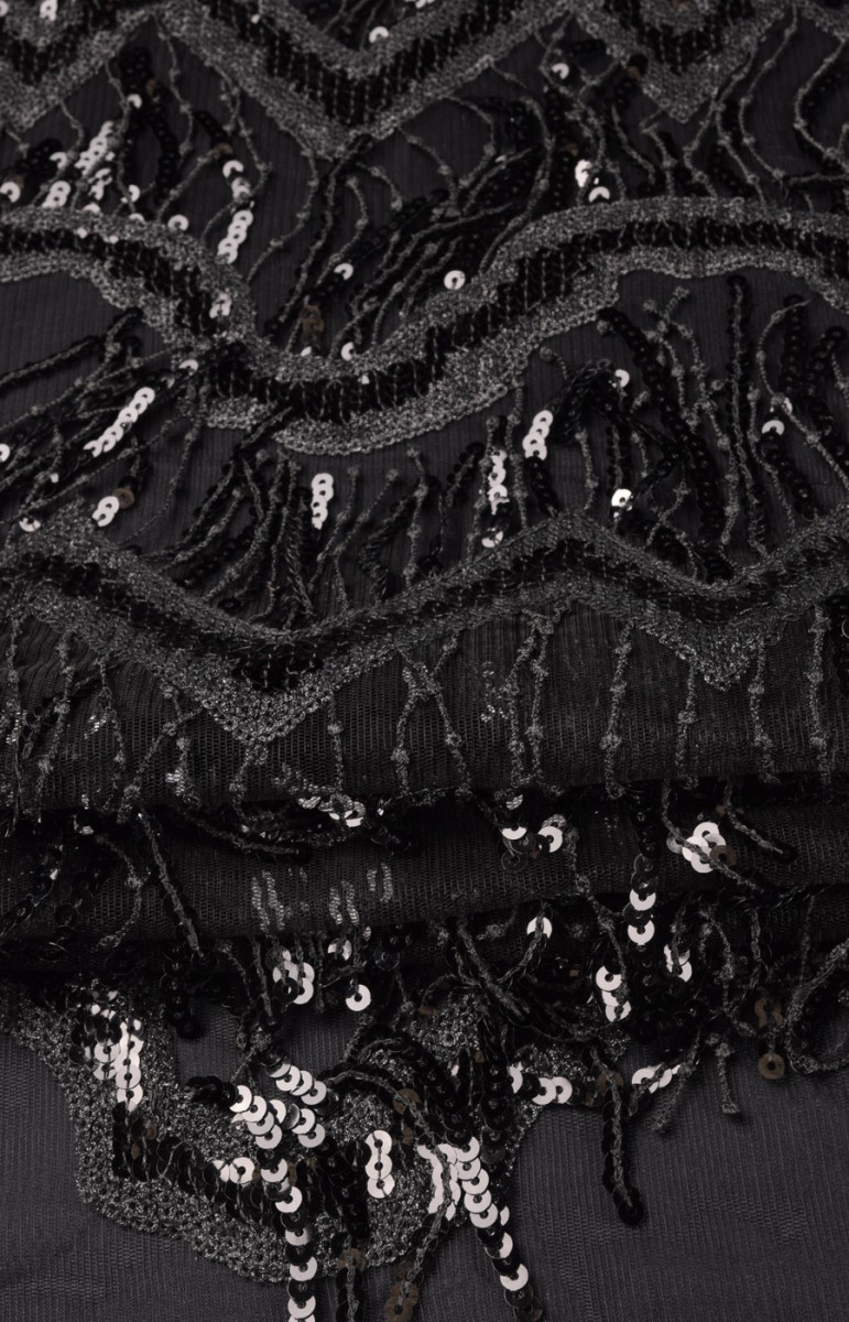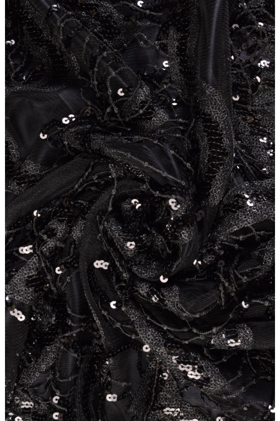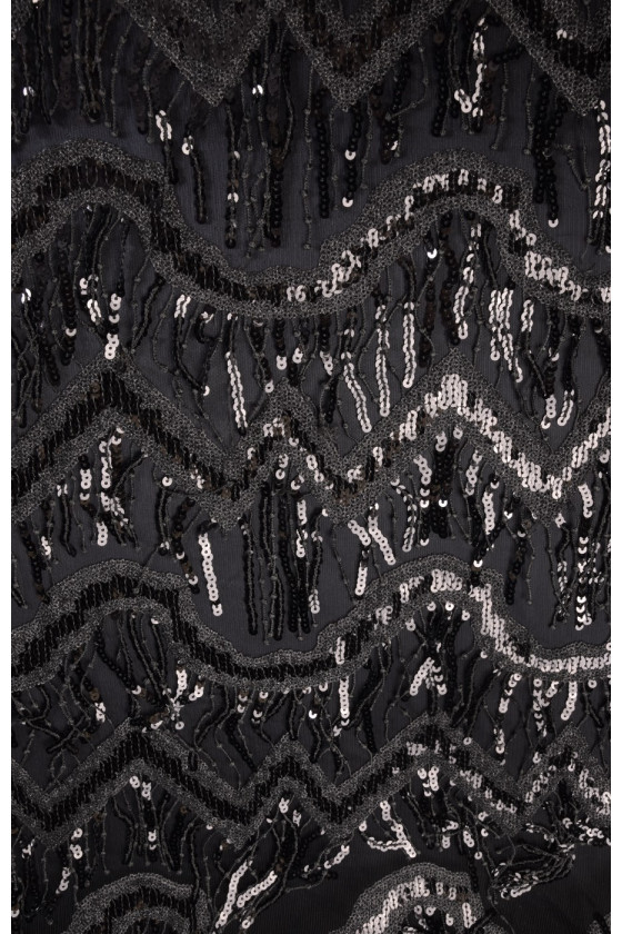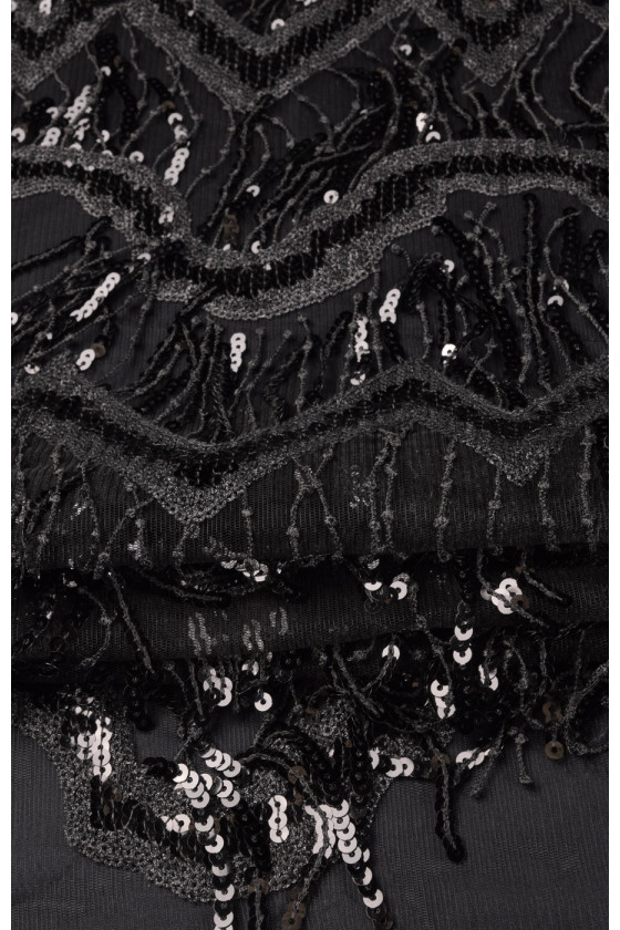 Tiulis siuvinėtas blizgučiais su juodais pakraščiais. Modelis sukuria bangas ir zigzagus. Rekomenduojame siūti elegantiškus vakarinius drabužius. Juodas šilko satinas puikiai tinka kaip pamušalas