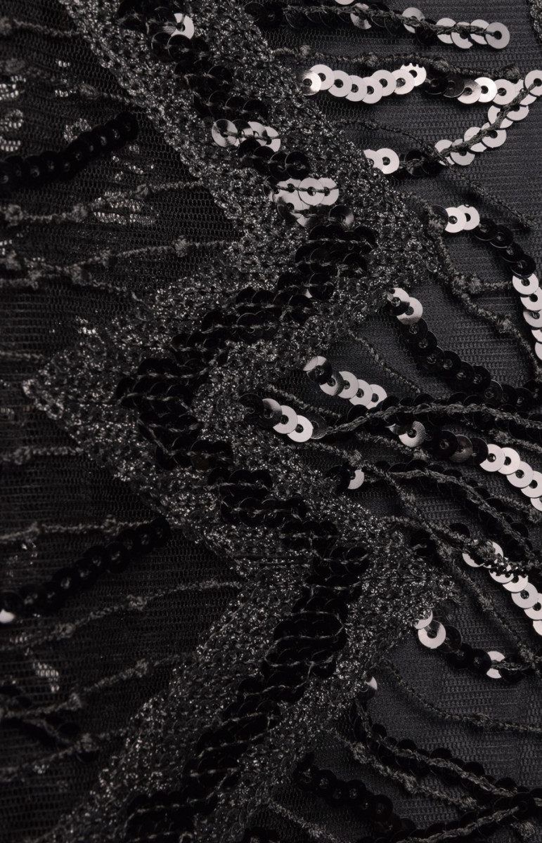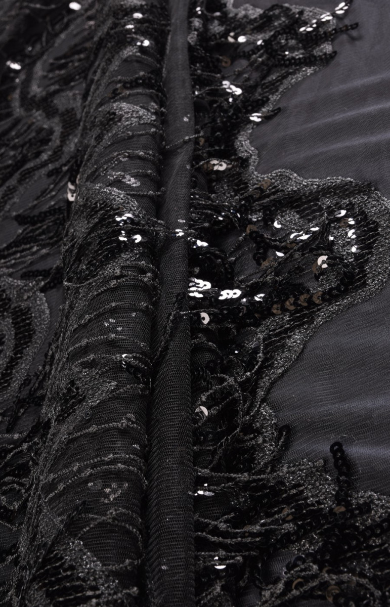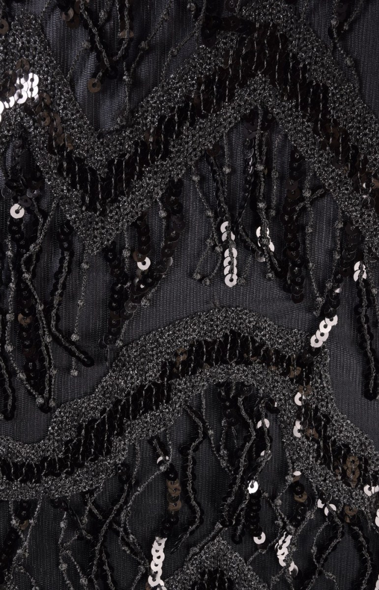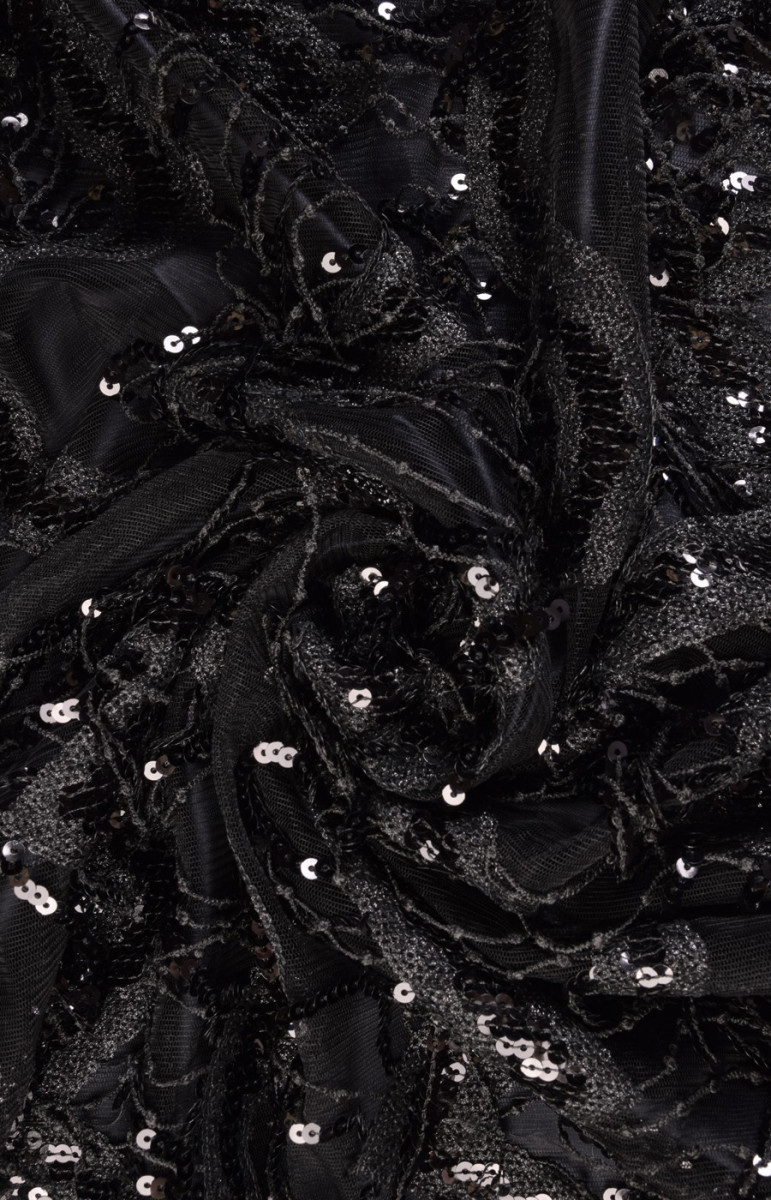 Tiulis siuvinėtas blizgučiais su juodais pakraščiais. Modelis sukuria bangas ir zigzagus. Rekomenduojame siūti elegantiškus vakarinius drabužius. Juodas šilko satinas puikiai tinka kaip pamušalas