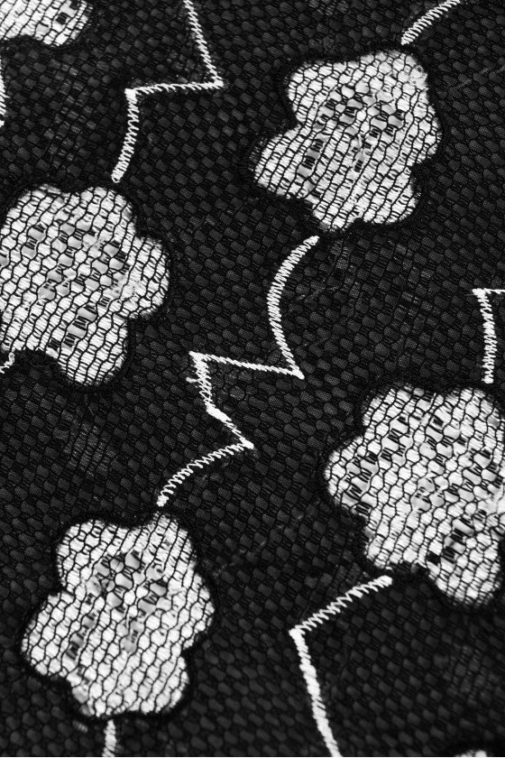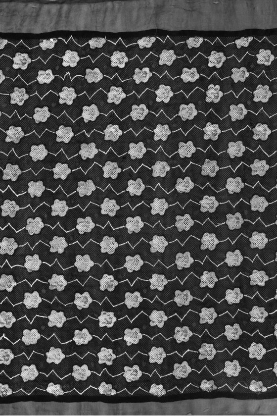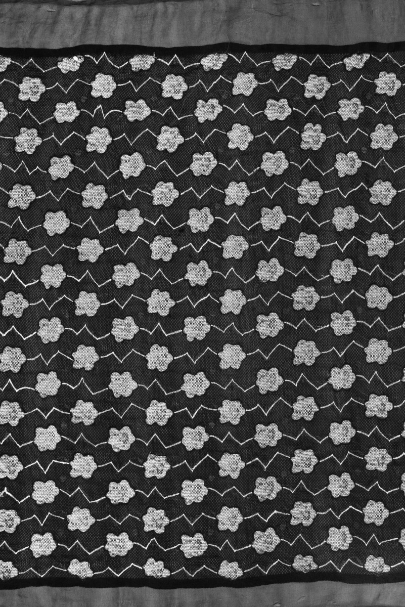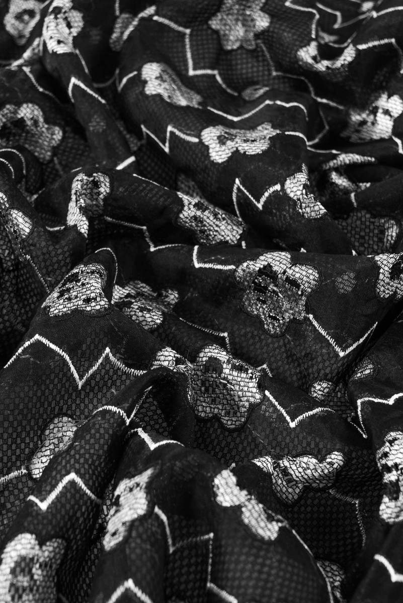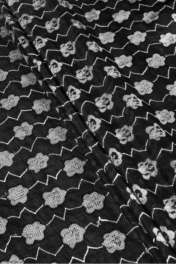 Itališkas 100% šilko organzos audinys juodos spalvos su siuvinėtomis pilkomis gėlėmis ir zigzagais. Audinys yra išklotas juodu tinkleliu su didelėmis akimis. Rašto plotis: 90 cm