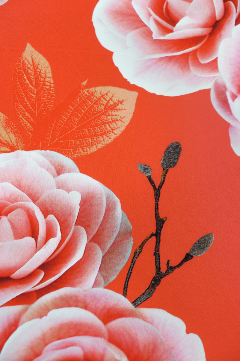 Itališkas koralų poliesterio audinys su didelių rožių žiedų motyvu (apie 25 cm). "Twill" yra audinys su pynimu, minkštas, labai patvarus, švelniai standus, kad tilptų.