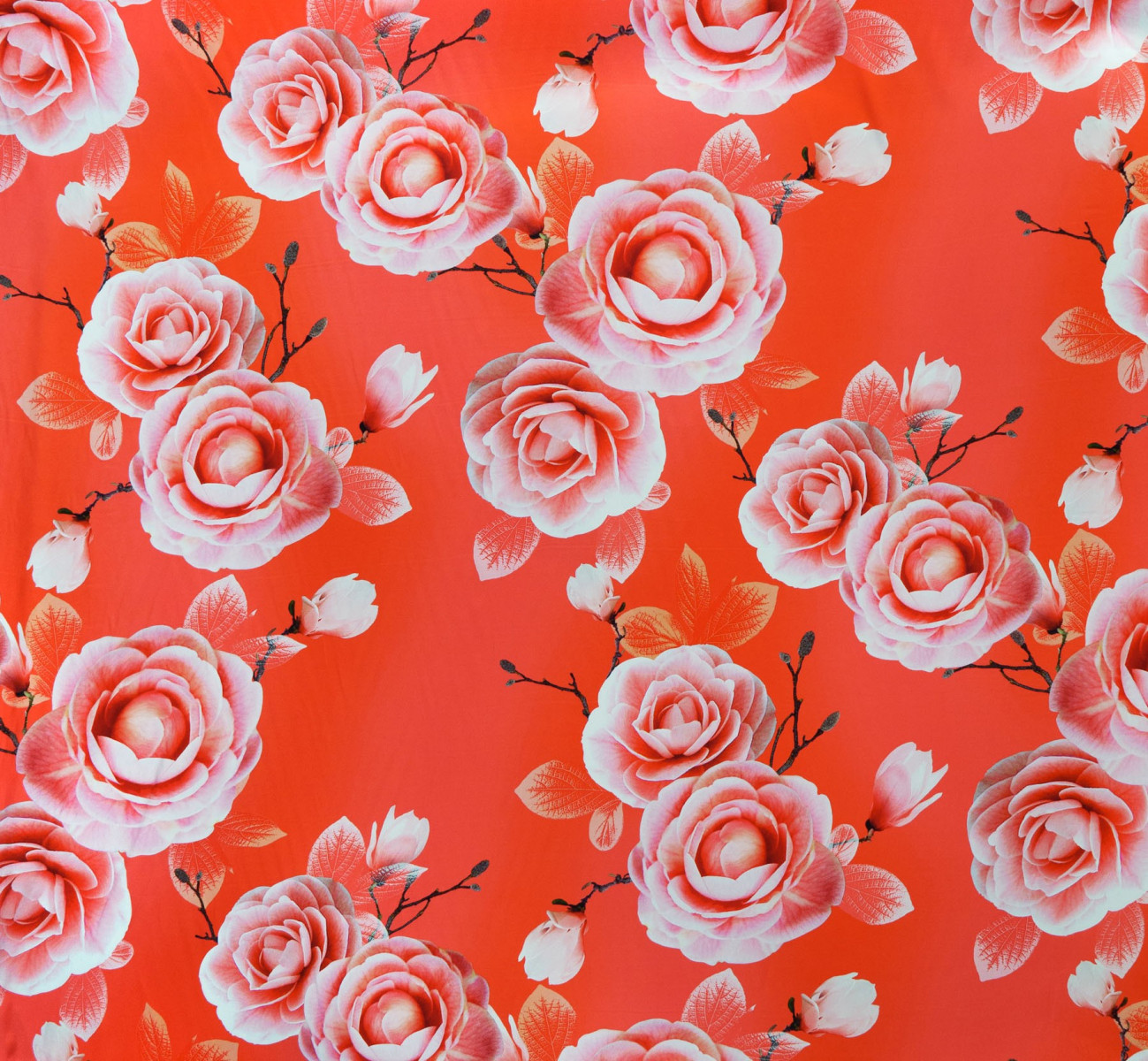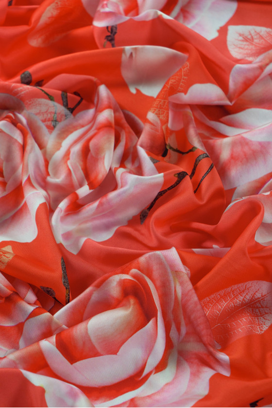 Itališkas koralų poliesterio audinys su didelių rožių žiedų motyvu (apie 25 cm). "Twill" yra audinys su pynimu, minkštas, labai patvarus, švelniai standus, kad tilptų. Puikiai tinka siūti marškinius, suknelę, sijoną ar skarą/šaliką.