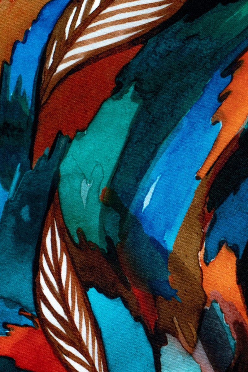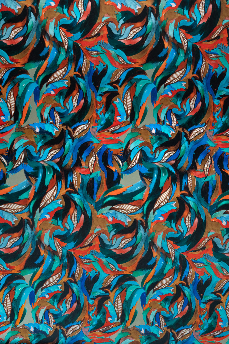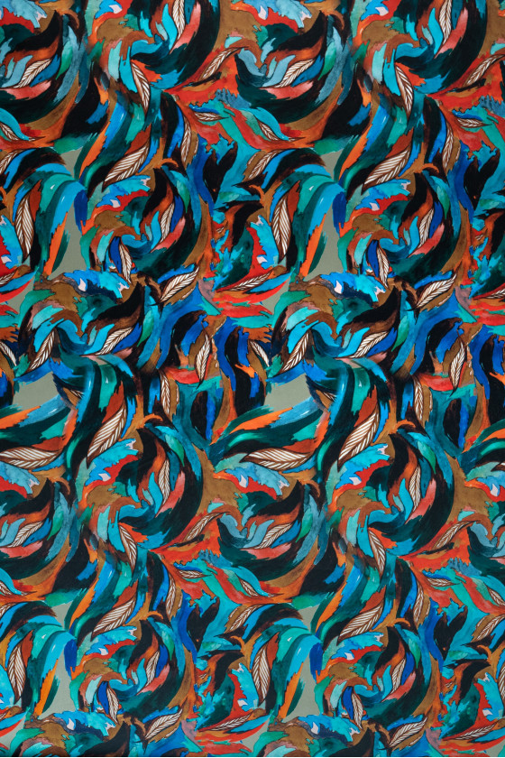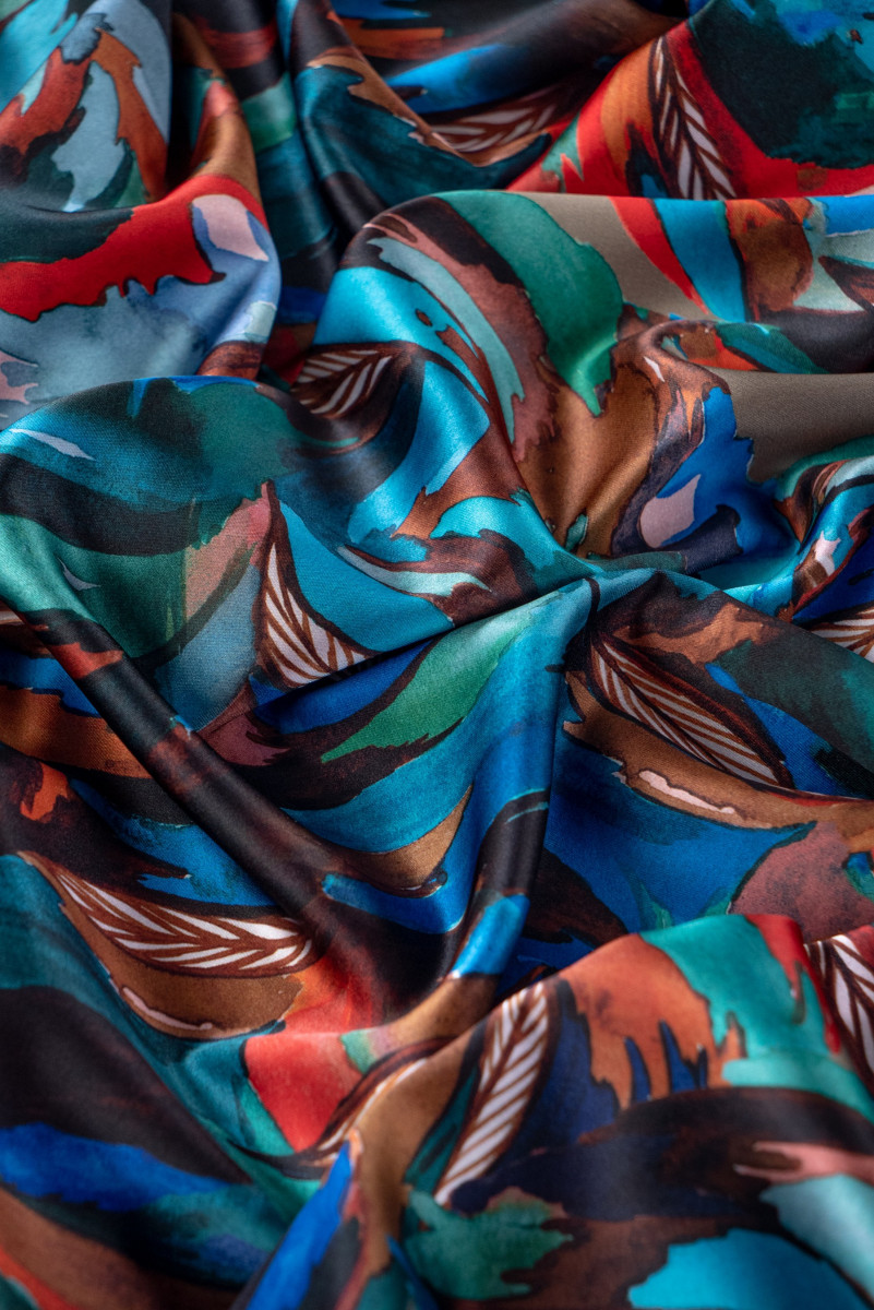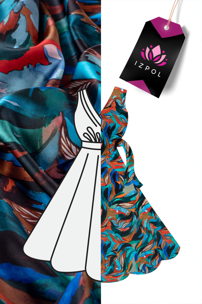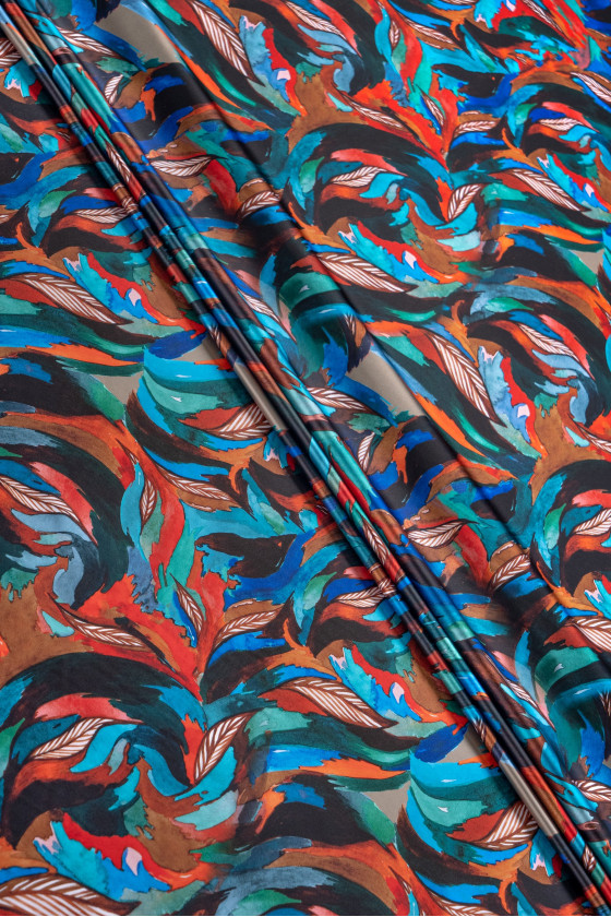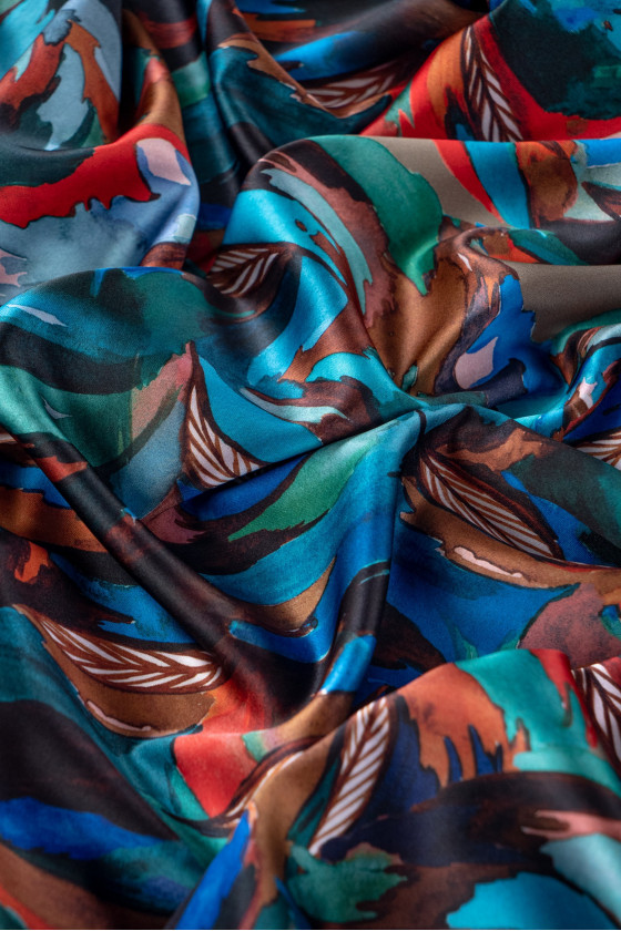 Itališkas, storesnis poliesterio satinas su spalvingų raštų ir lapų motyvu. Satinas yra tankus ir lengvas audinys su plokščiu paviršiumi, pagamintas satino pynimu. Papildomas pranašumas yra jo lygumas ir ilgaamžiškumas, taip pat tai, kad jis labai gerai tinka, nerodo ir yra malonus liesti. Viena vertus, jis yra matinis, kita vertus, jis yra švelniai blizgus. Jis gali būti naudojamas erdvioms suknelėms, subtilioms palaidinėms, sijonams, šalikams, šalikams užburti.